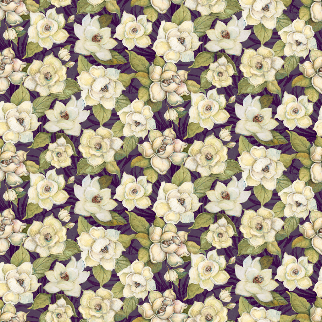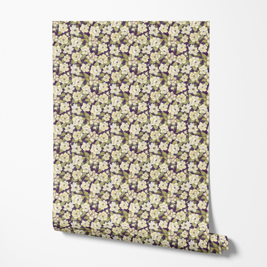 This elegant floral pattern features delicate white magnolias with green leaves against a rich purple background, creating a timeless vintage-inspired feel that is perfect for any space.