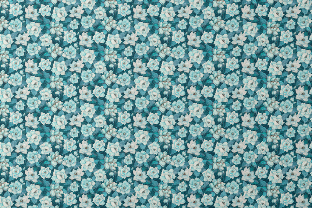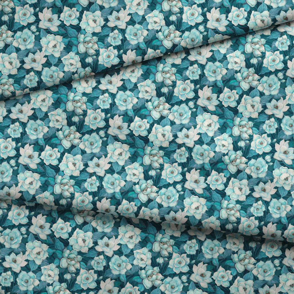 Beautiful floral pattern featuring white and blue magnolias against a rich teal background, creating an elegant botanical and a vintage-inspired feel.