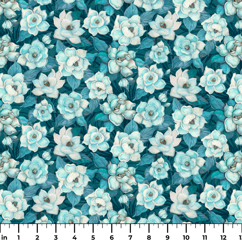 Susan Winget Garden Magnolias on Teal Fabric