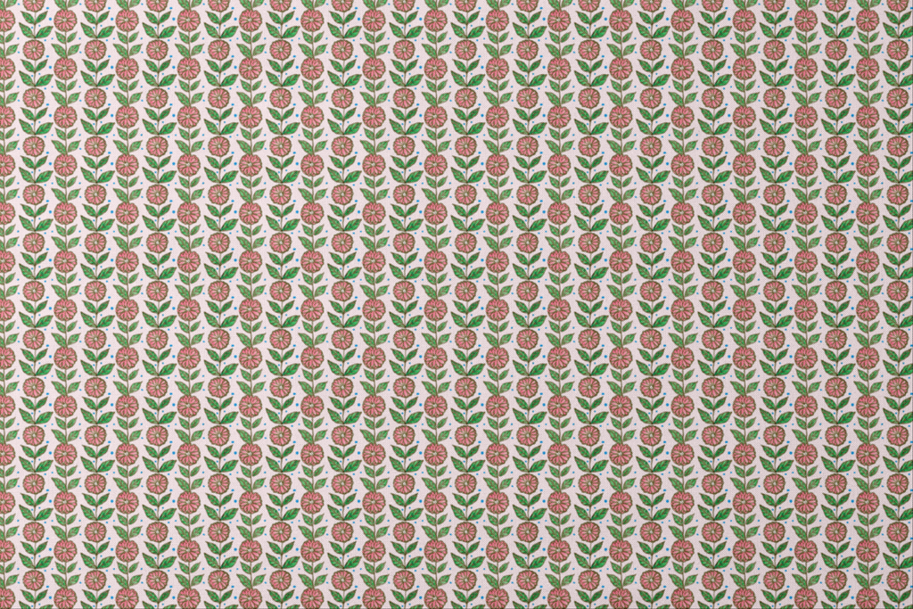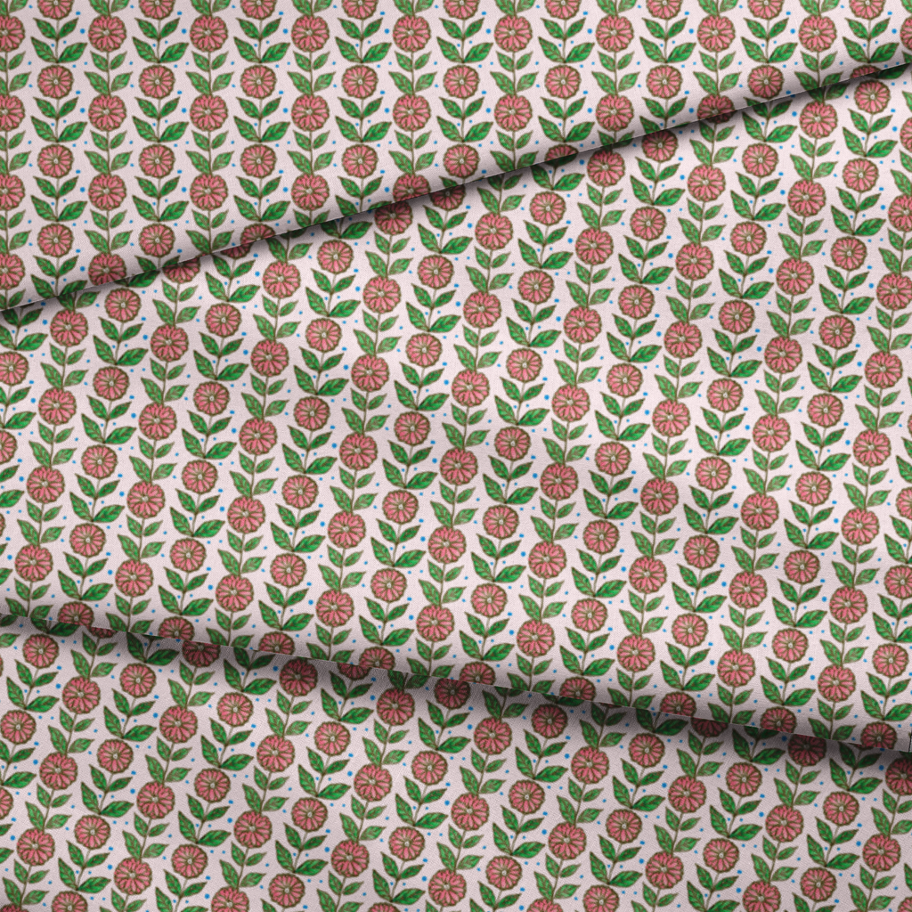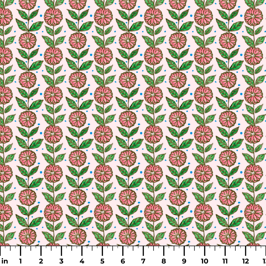 Watercolor-inspired pink zinnias bloom against a soft cream background, each flower rendered with charming hand-painted detail and outlined in earthy brown. Vibrant green leaves frame each blossom while scattered blue dots add playful rhythm throughout the pattern. This whimsical botanical print would shine in spring and summer quilting projects or as cheerful accent pillows for your garden room.