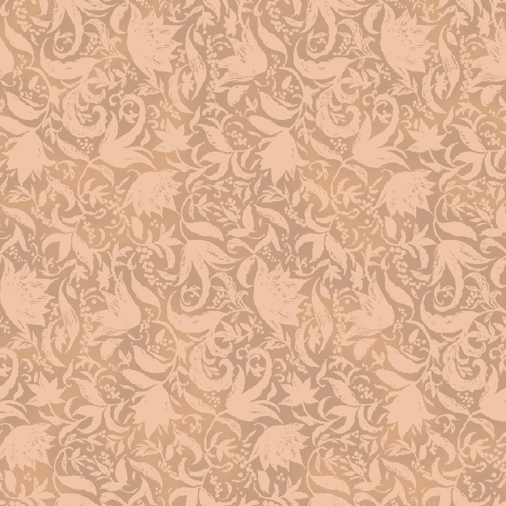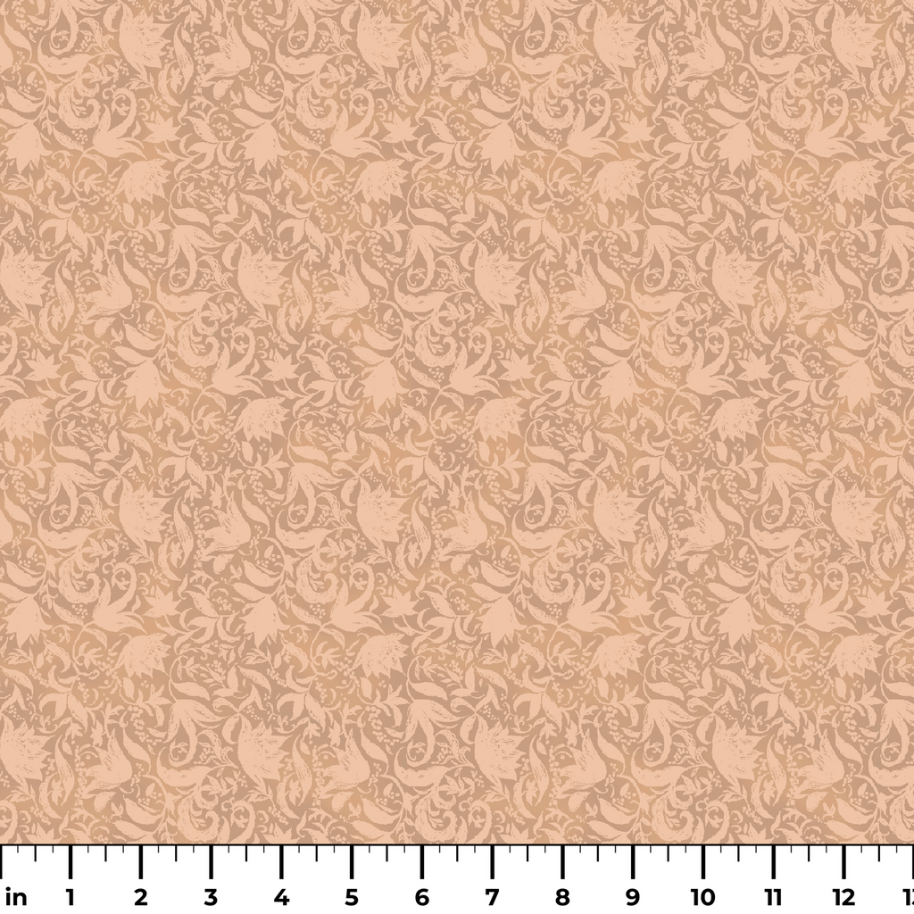 Swirling leaves and botanical motifs dance across this elegant monochromatic fabric in warm beige and cream tones. The textured, painterly quality of the design gives it a hand-stamped appearance, with delicate berries and graceful foliage creating a sophisticated pattern that feels both timeless and organic. This versatile neutral would add subtle richness to quilting projects, home décor accents, or as a refined backing for wall hangings.
