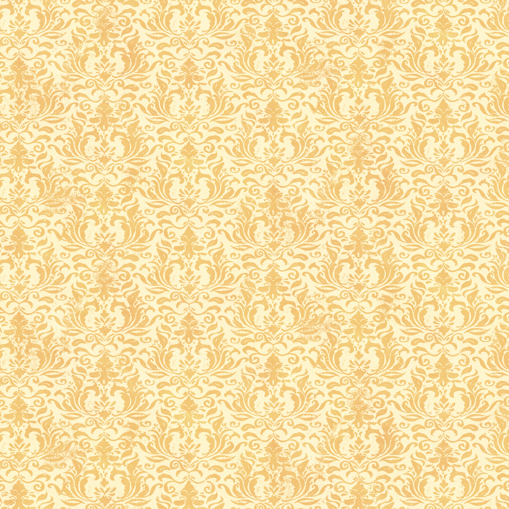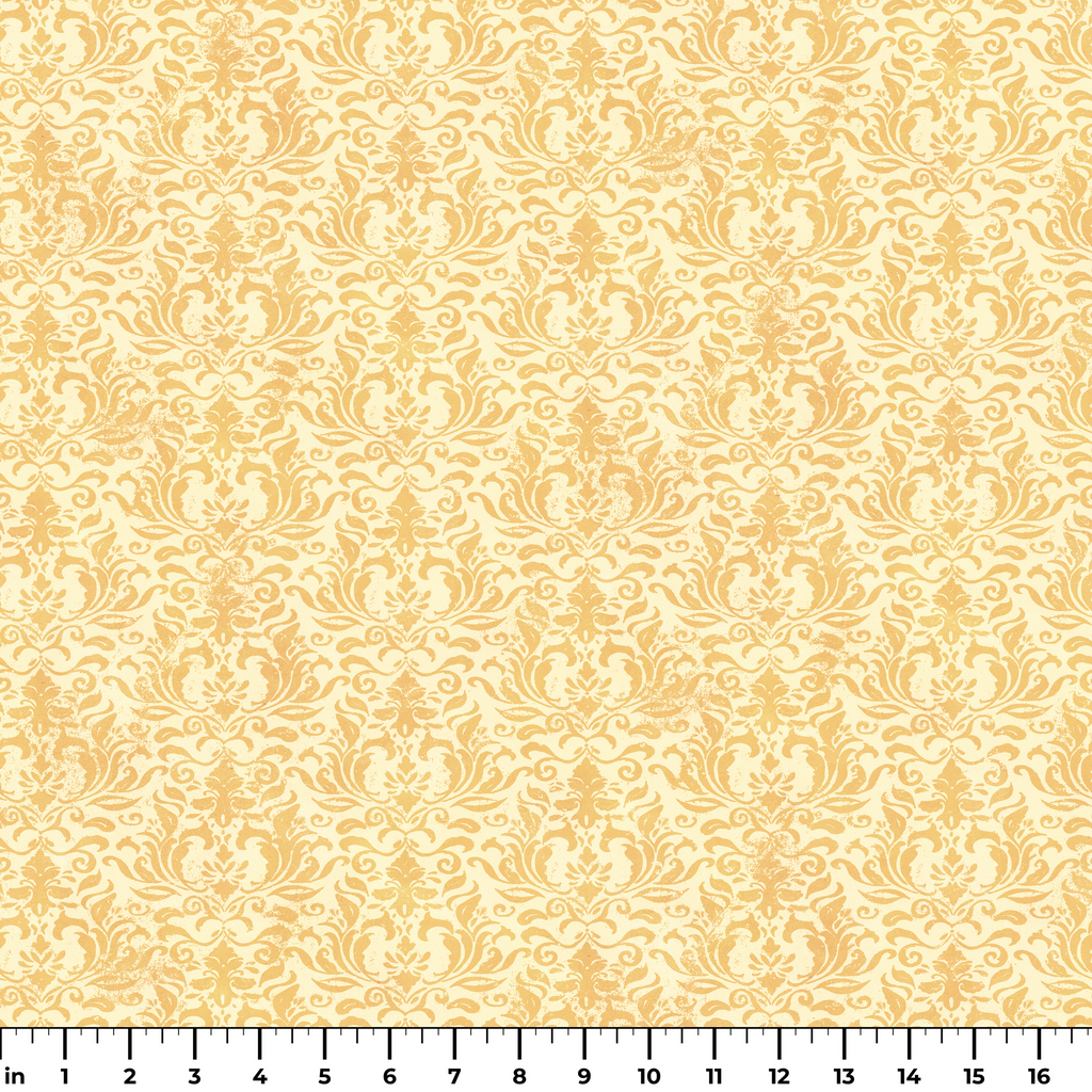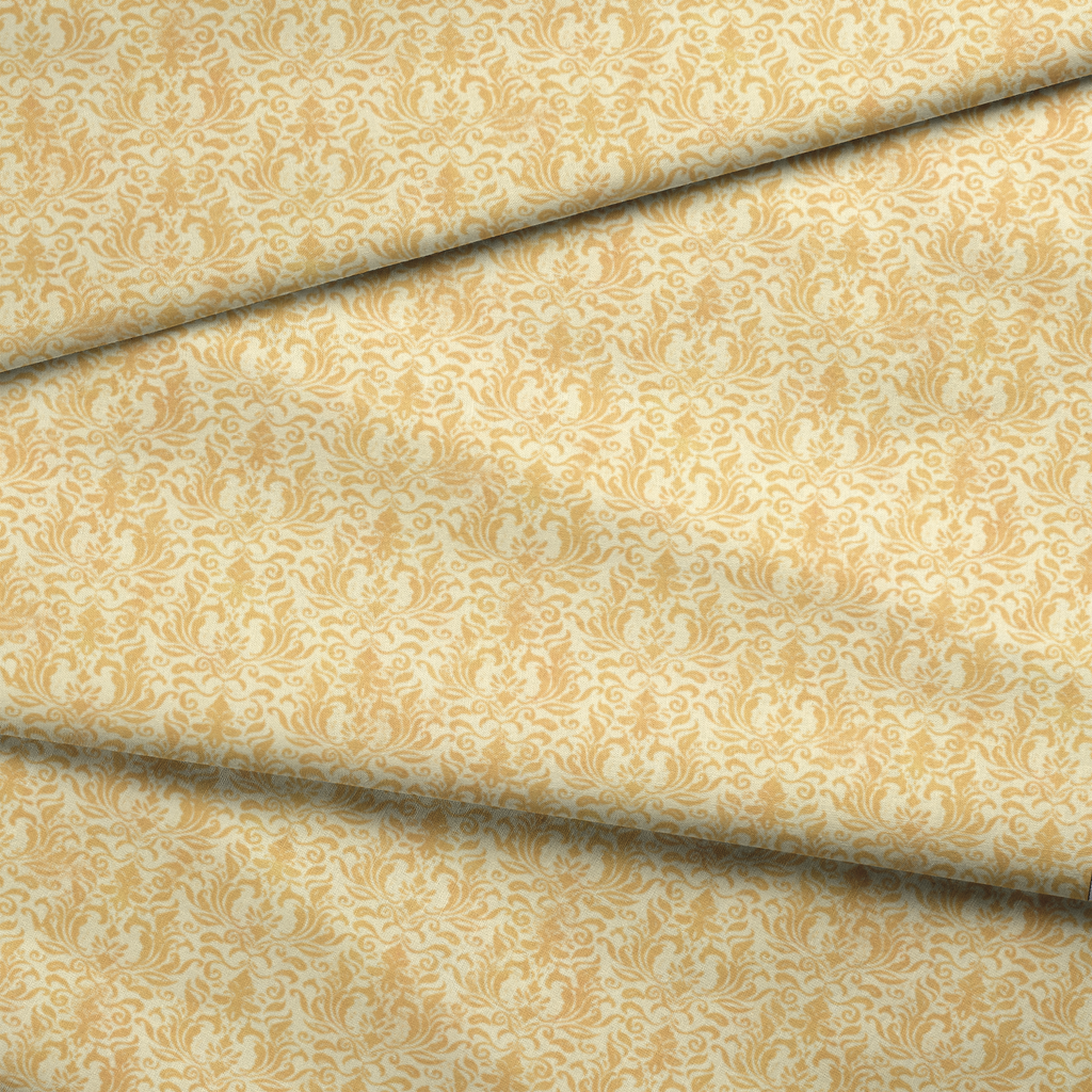 Delicate baroque-inspired scrollwork creates an elegant damask pattern in rich golden hues against a soft cream background. The slightly distressed texture gives this fabric a vintage, timeworn charm while maintaining its sophisticated appeal. Perfect for creating luxurious home accents like accent pillows and window treatments, or as an elegant base for special occasion quilting projects.