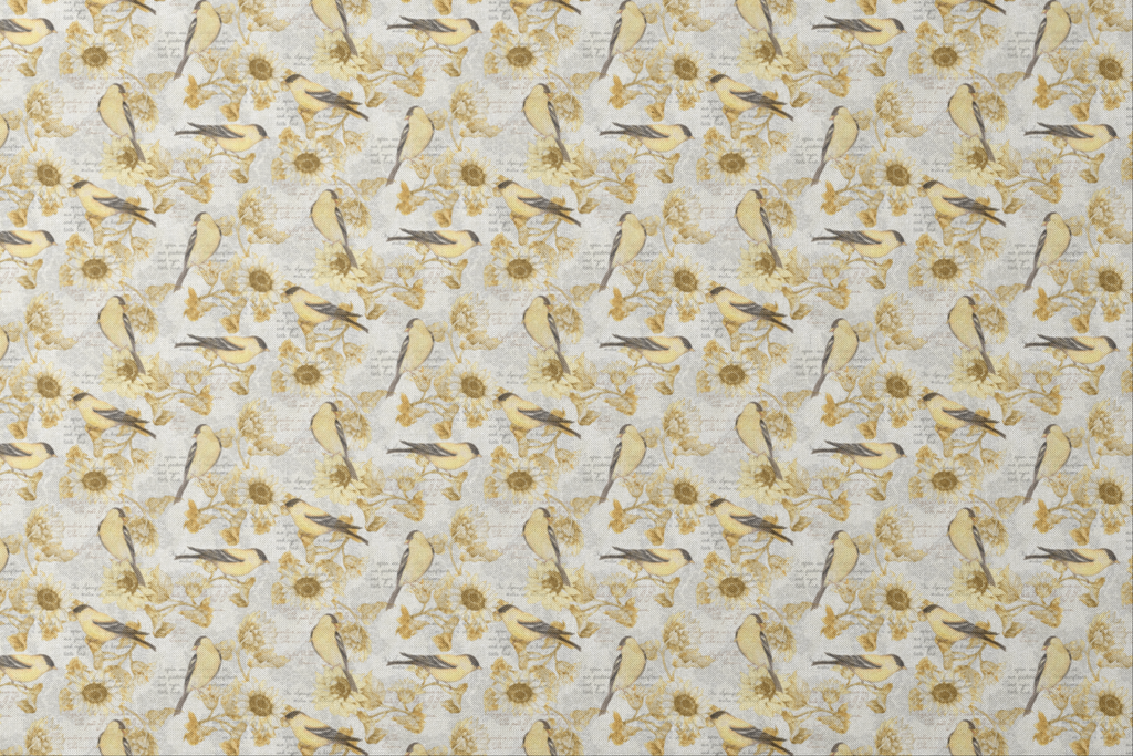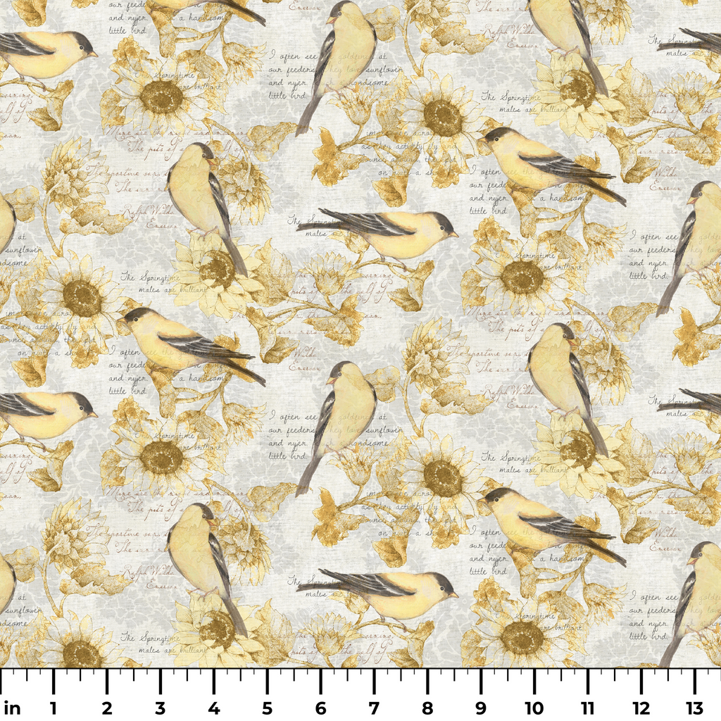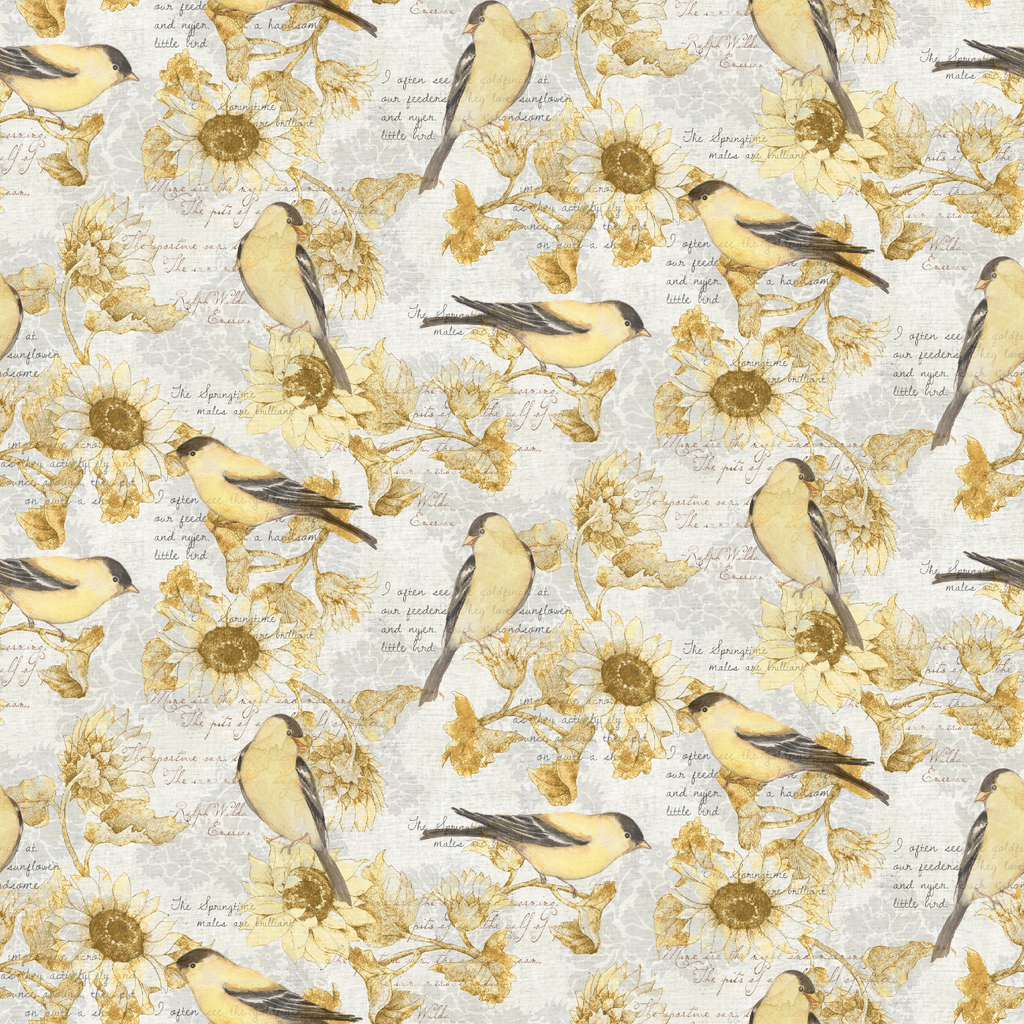 Delicate goldfinches perch among soft golden sunflowers on this enchanting fabric featuring vintage-inspired script text layered throughout. The muted palette of buttery yellows, warm gold, and subtle grays creates a peaceful, nature-inspired aesthetic that captures the charm of a garden journal come to life. Perfect for creating cottage-style kitchen accessories or serene bedroom decor that brings the tranquility of nature indoors.