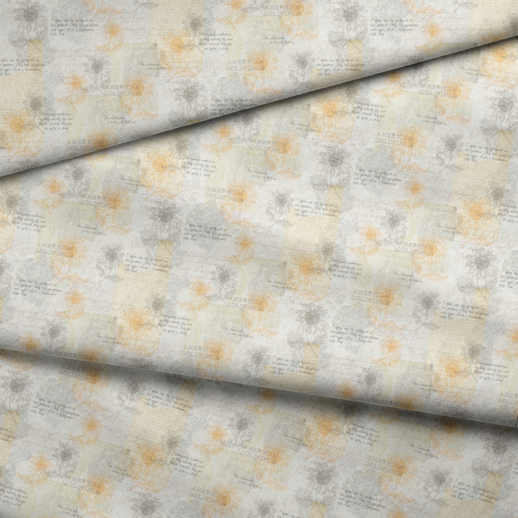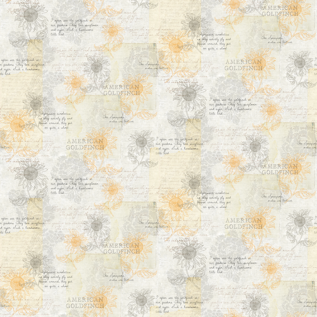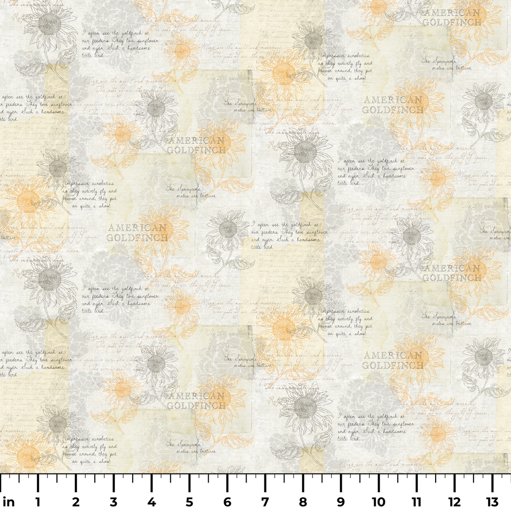 This elegant fabric features delicate line drawings of sunflowers in golden yellow and soft gray, interspersed with handwritten notes about American Goldfinches against a creamy vintage background. The subtle script and botanical illustrations create a journal-like quality, with thoughtful observations about the birds' playful nature and fondness for sunflowers. Perfect for nature-themed quilting projects, book covers, or decorative pillows in a sunroom or reading nook.
