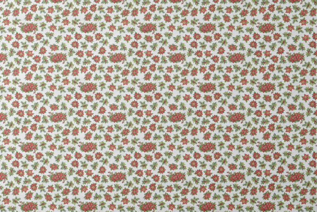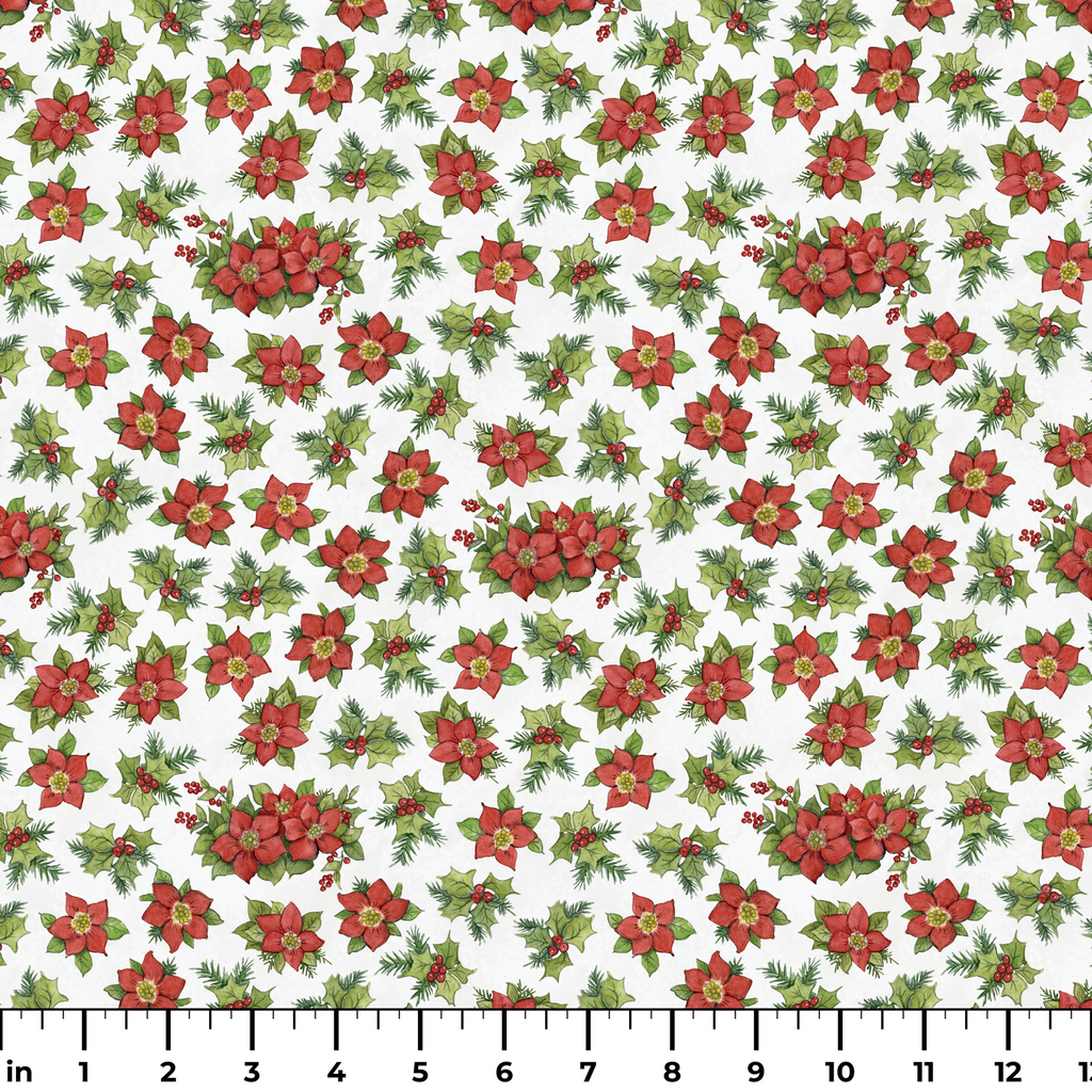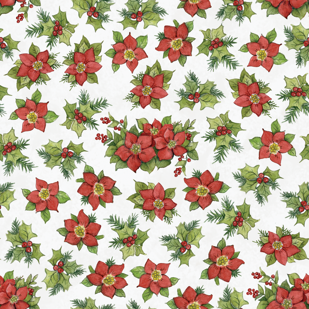 Beautiful Christmas poinsettia pattern with vibrant red flowers and green pine sprigs scattered across a crisp white background, perfect for holiday decor.