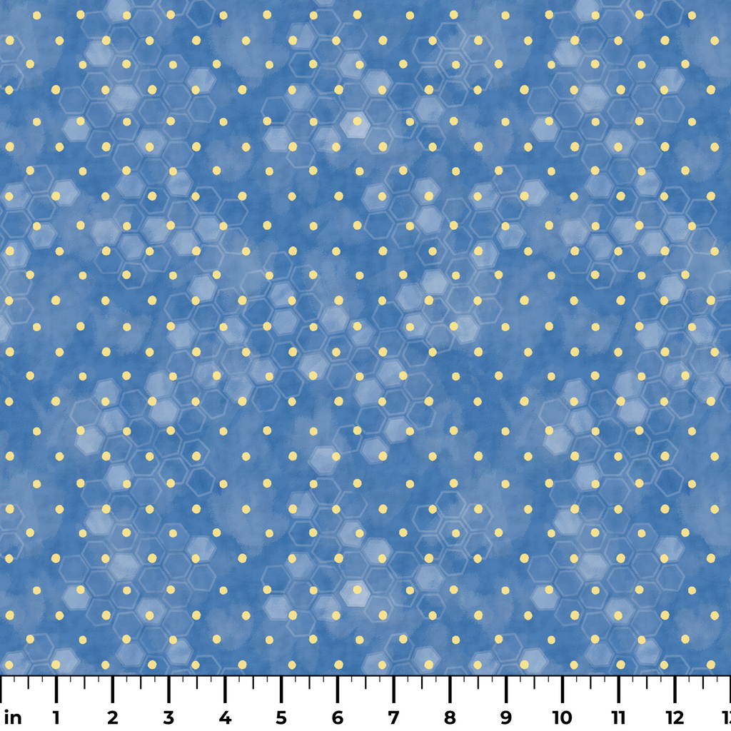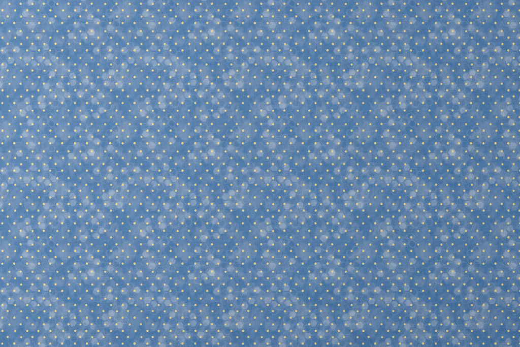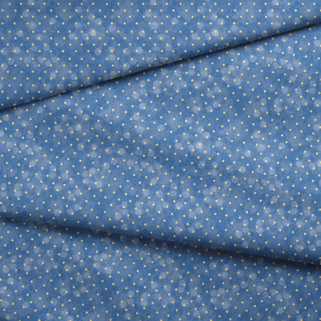Delicate honeycomb pattern with small yellow polka dots and hexagonal outlines on a blue background, perfect for contemporary home decor or modern quilting projects.