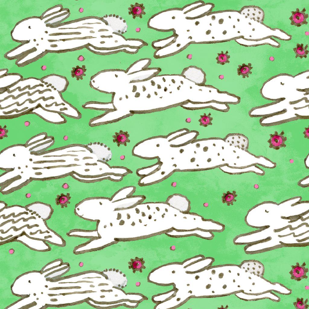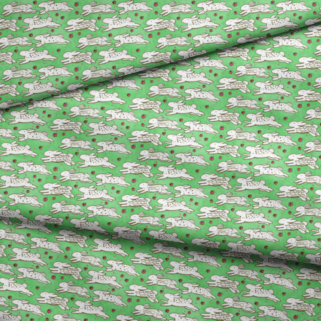 Playful white bunnies hop across a cheerful spring green background, each rabbit uniquely adorned with hand-drawn spots and textures. Magenta flowers with brown centers dot the landscape, creating a whimsical garden where these cottontails frolic. This sweet, illustrative design brings a touch of storybook charm to children's quilts, spring table linens, or Easter-themed craft projects.