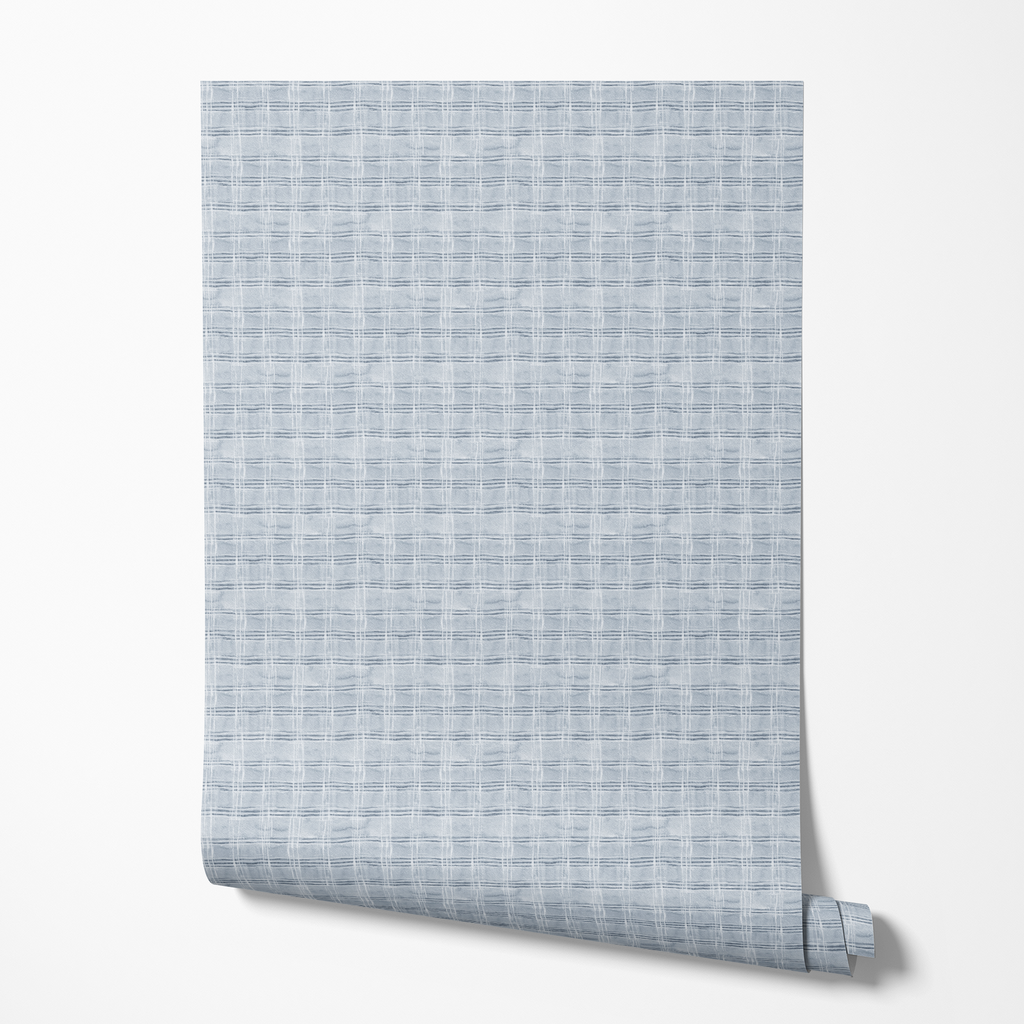 Soft blue-gray plaid fabric with delicate white grid pattern creates a subtle textured background perfect for modern home decor.