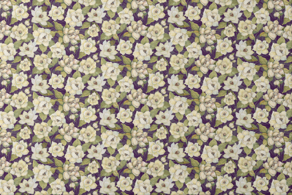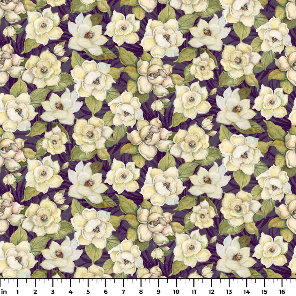 Lush magnolias bloom across a deep purple background in this striking floral fabric. The creamy ivory blossoms have a hand-painted quality, with delicate shading and rich brown centers that add depth and dimension. Paired with sage green leaves that twist and turn throughout the design, this fabric brings a touch of Southern garden elegance to any project. Perfect for statement quilting pieces or accent pillows that need that special touch of botanical sophistication.