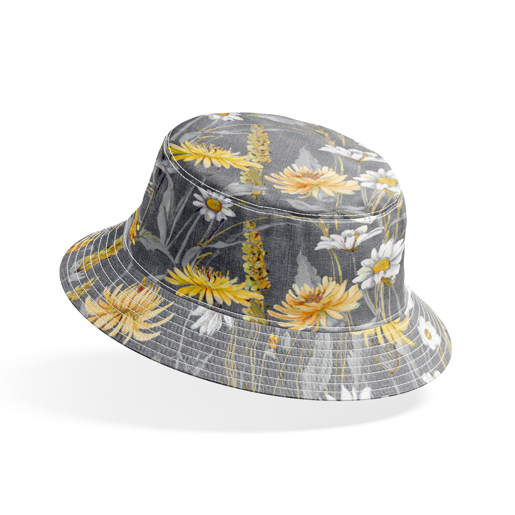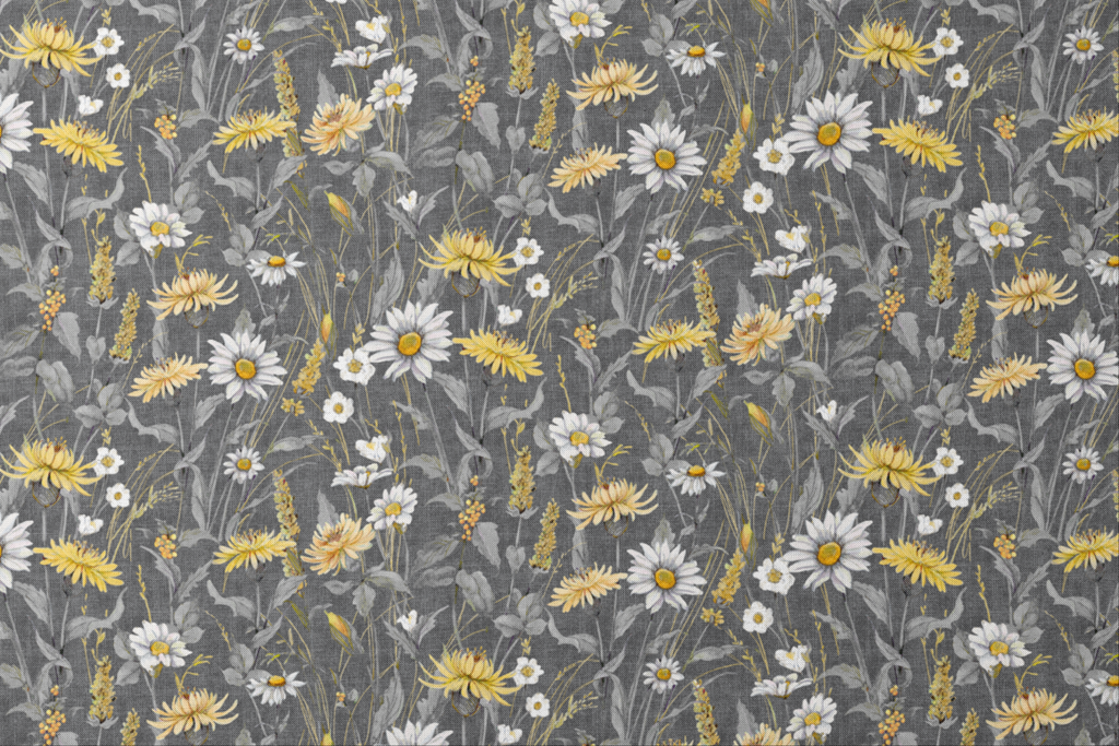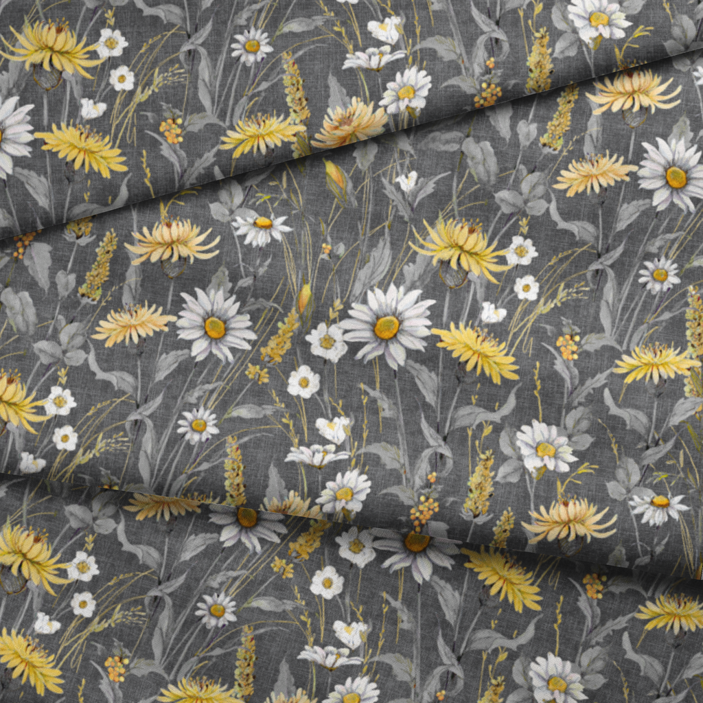 Crisp white daisies and sunny yellow chrysanthemums dance among delicate wildflowers against a sophisticated charcoal gray background with a linen-like texture. The muted gray foliage creates depth while golden accents add warmth to this garden-inspired design. Perfect for creating statement throw pillows or a nature-inspired tote bag that brings a touch of meadow charm to your everyday accessories.