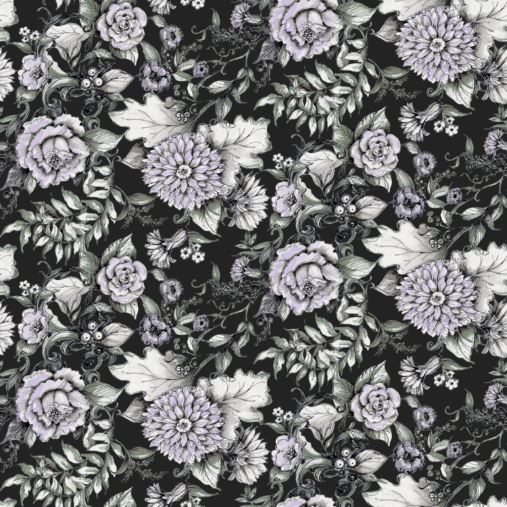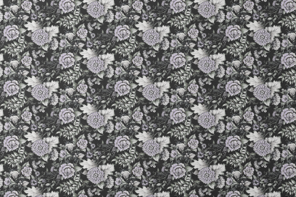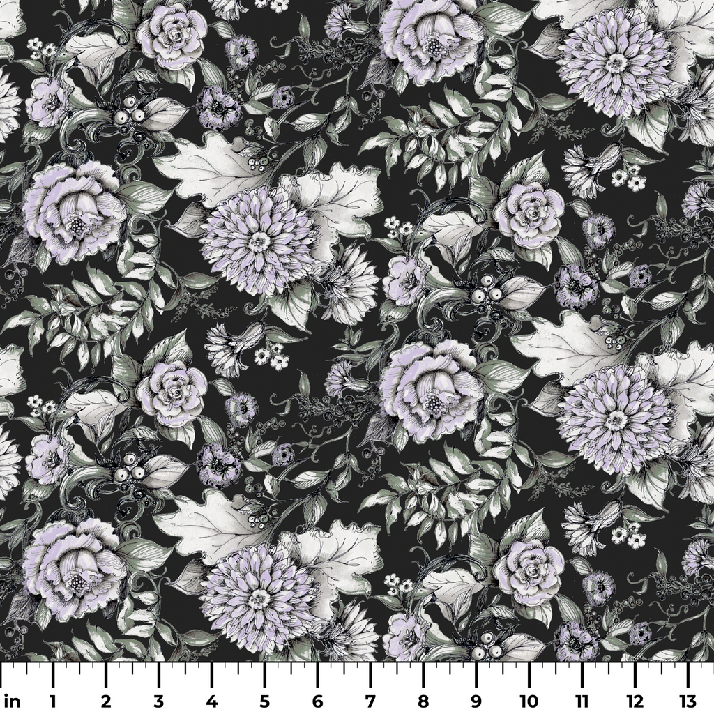 Dramatic blooms dance across a midnight black backdrop in this sophisticated floral print. Lavender-tinged roses and dahlias intermingle with silvery leaves and delicate berries, creating a moody botanical masterpiece with just a hint of purple. This elegant fabric would make a stunning accent pillow or statement piece in a modern quilting project, adding depth and artistic flair to your home décor.