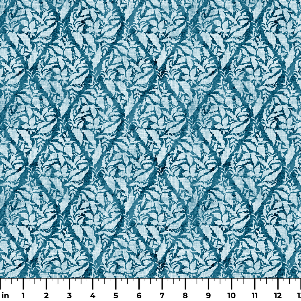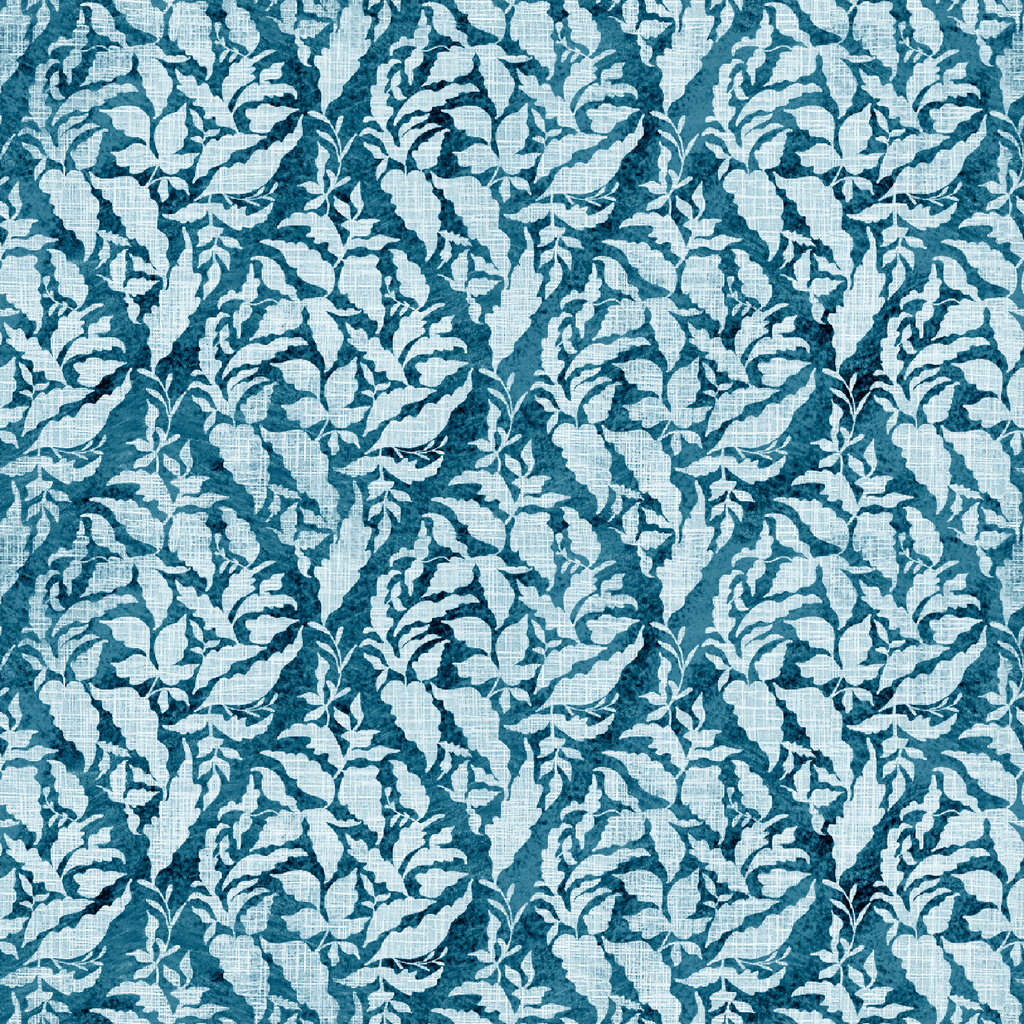Elegant blue and white botanical diamond pattern featuring leaves and foliage in a cool colorway, perfect for home decor.