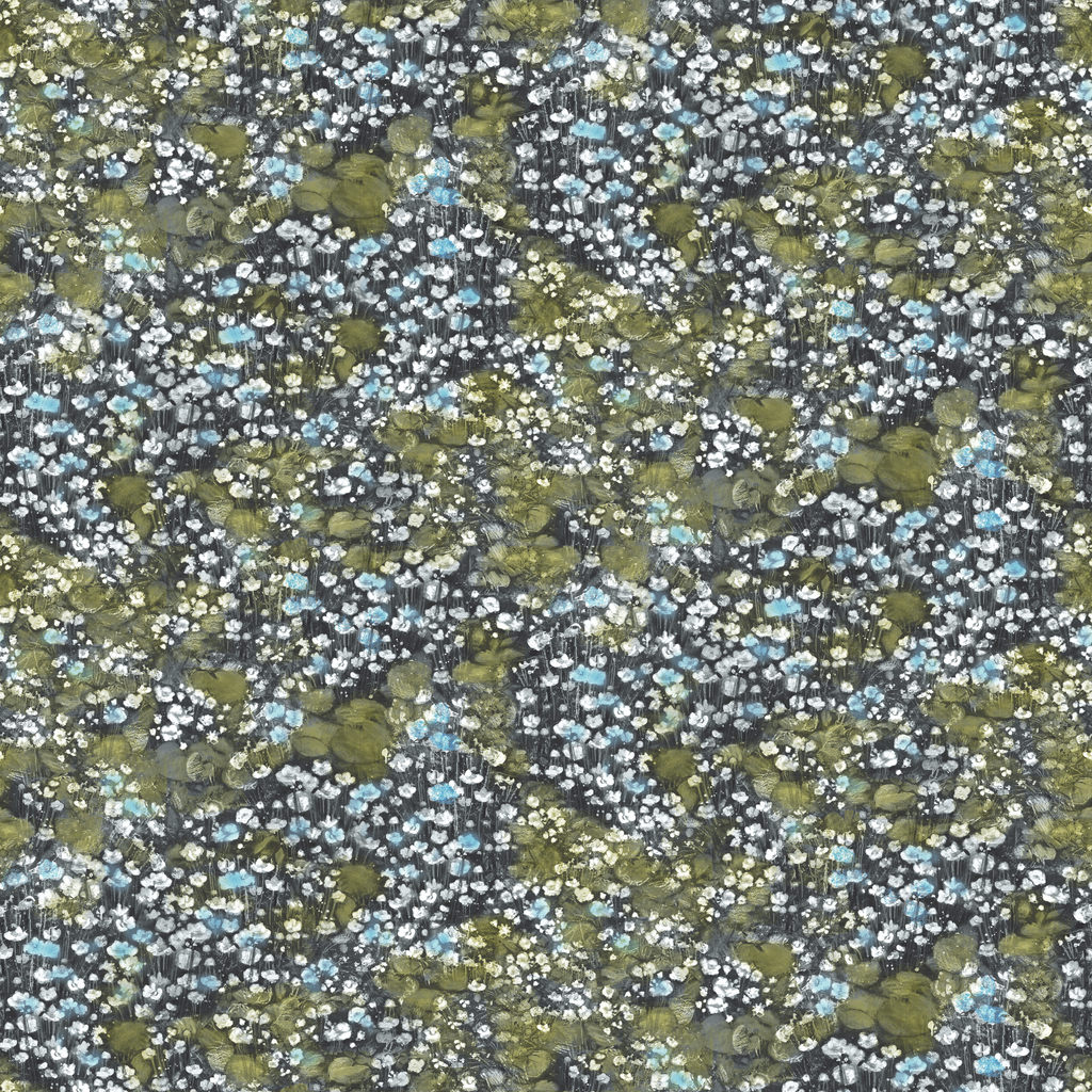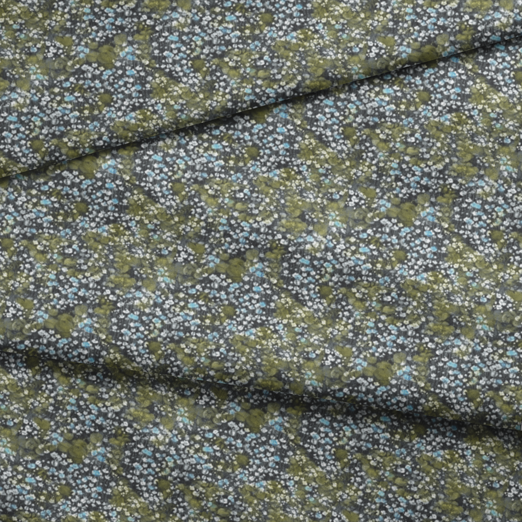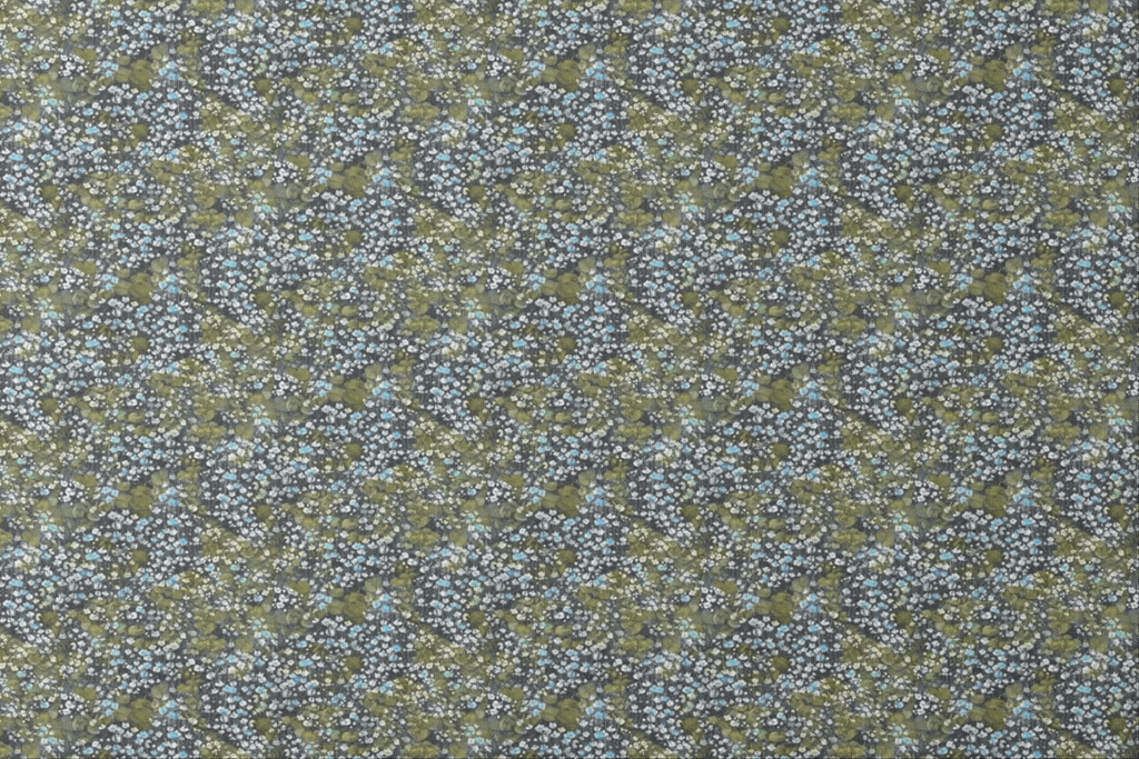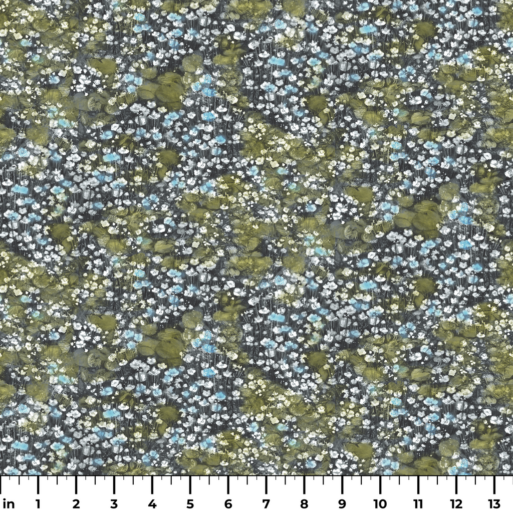 This enchanting fabric features a meadow of delicate wildflowers scattered across a field. Tiny white and soft blue blooms dance among olive green leaves, creating the impression of a secret garden. The painterly quality gives the pattern depth and movement, making it perfect for spring quilting projects or accent pillows that bring a touch of nature indoors.