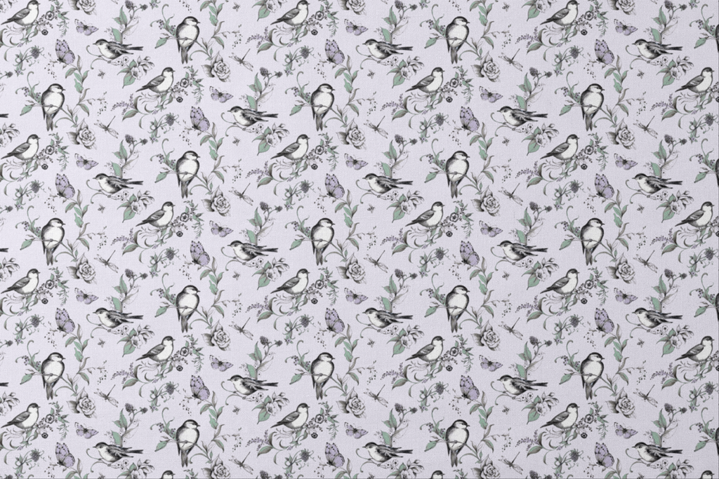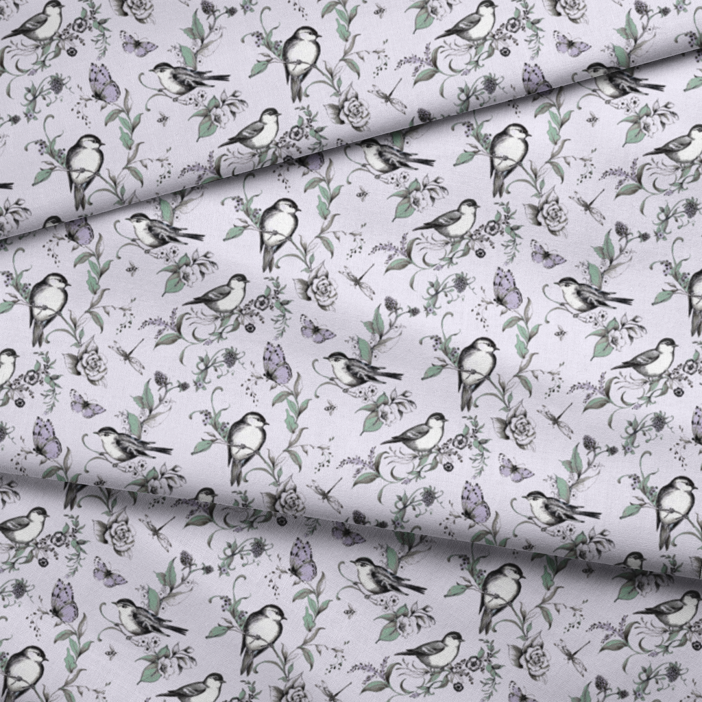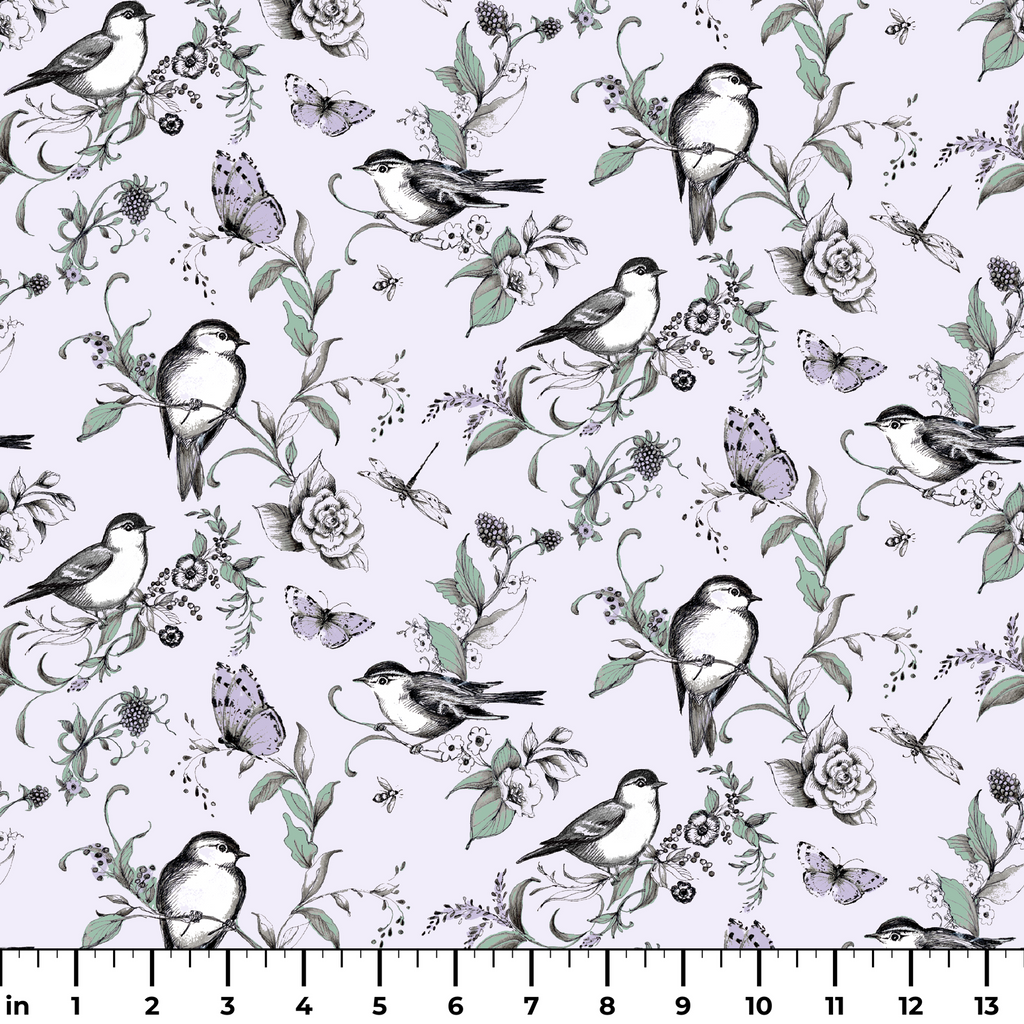 Delicate birds perch among sketched botanical elements in this sophisticated lavender-based fabric. The intricate black and white birds create a striking contrast against soft sage green leaves, while subtle lavender butterflies add unexpected pops of color to the serene design. This enchanting print would make a stunning accent for pillows in a sunroom or transform into an eye-catching quilt that brings the gentle beauty of nature indoors.