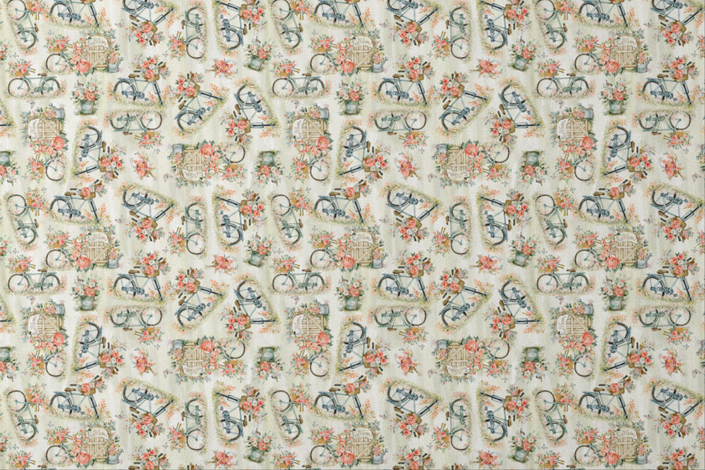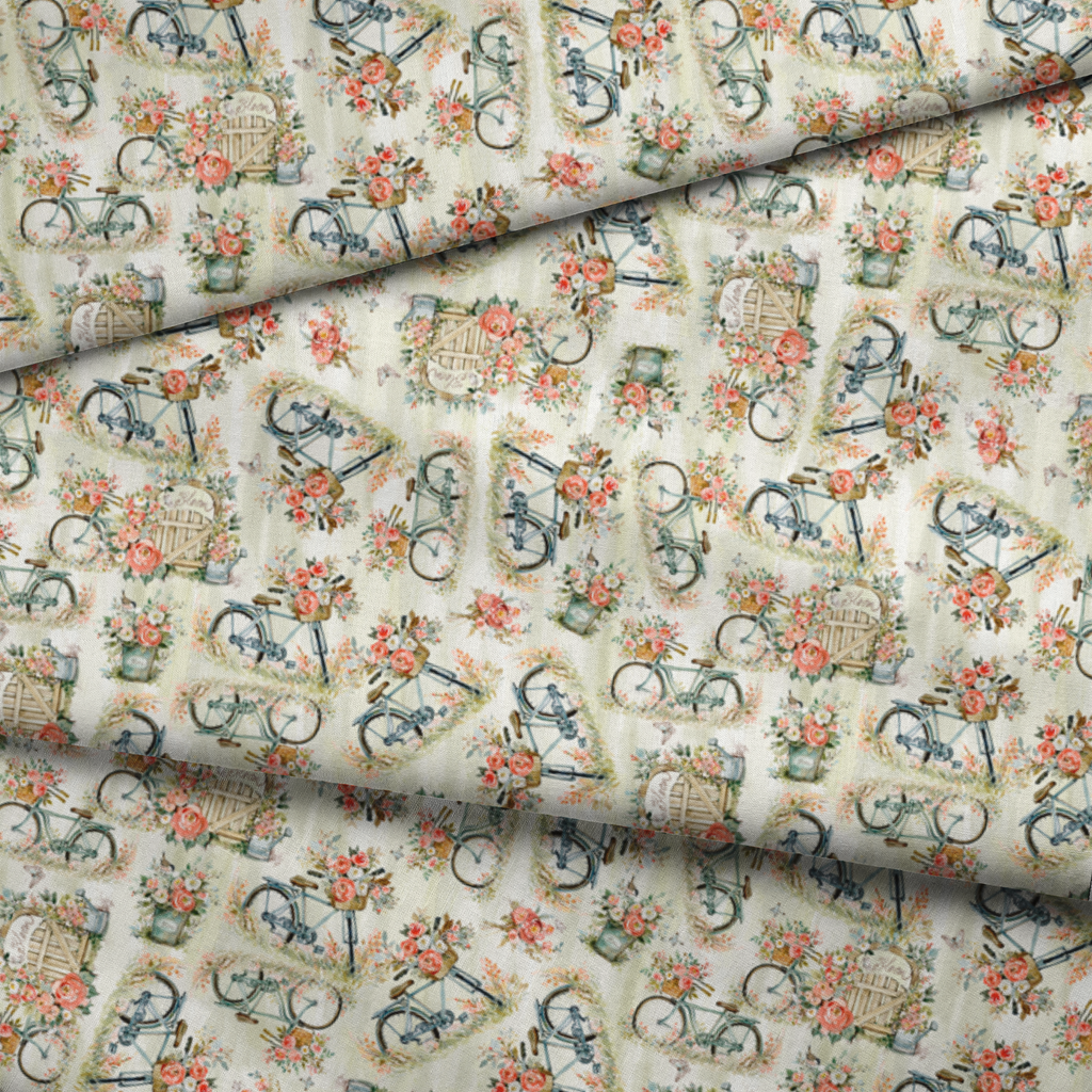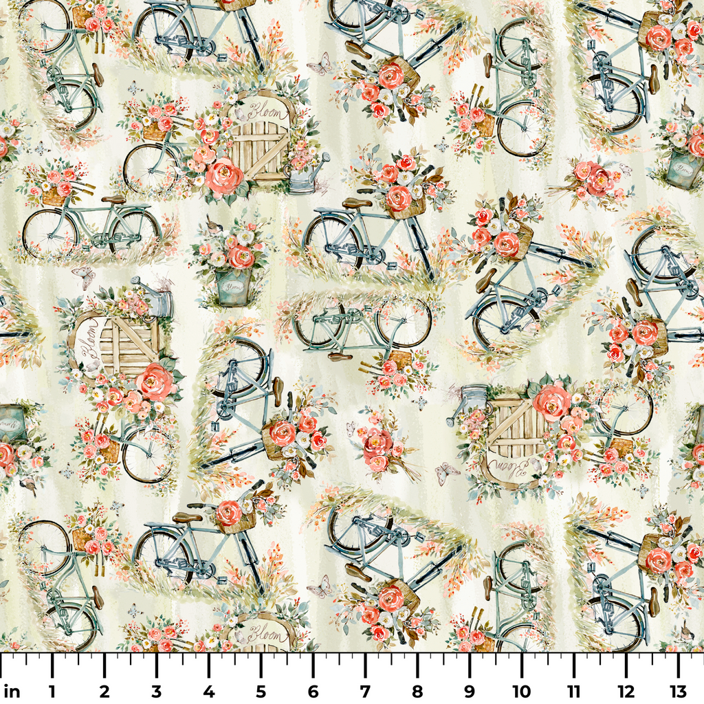 This charming cottage garden fabric features vintage blue bicycles adorned with baskets of coral and peach roses scattered across a soft cream background. Delicate garden gates labeled "Bloom" and wispy butterflies add whimsical touches to this nostalgic design, creating a perfect balance of romance and countryside charm. The watercolor-style illustrations give the pattern a handcrafted feel, making it ideal for spring quilting projects, cottage-style pillowcases, or garden-themed tote bags.