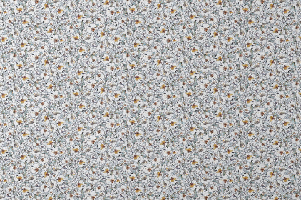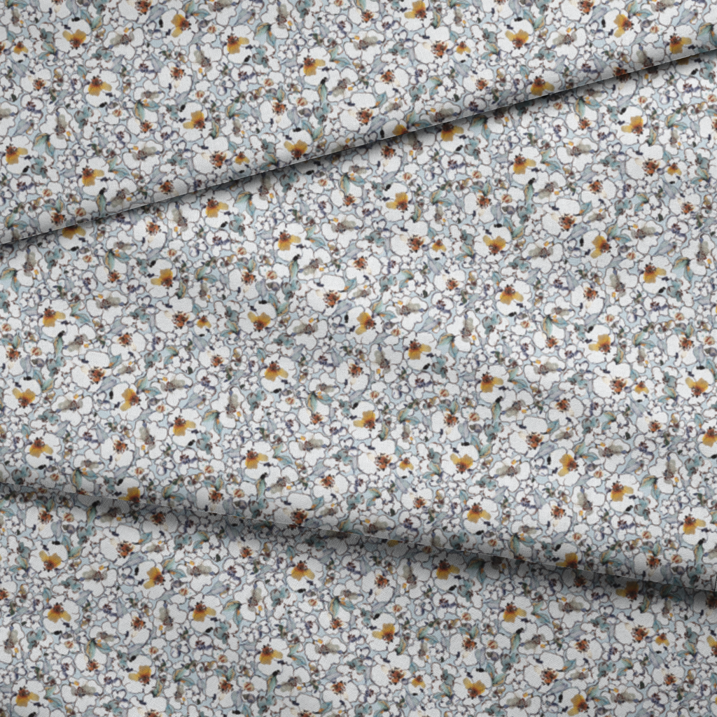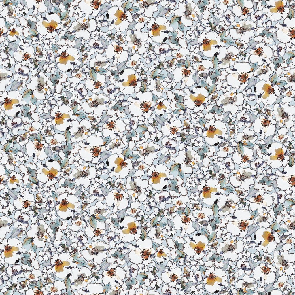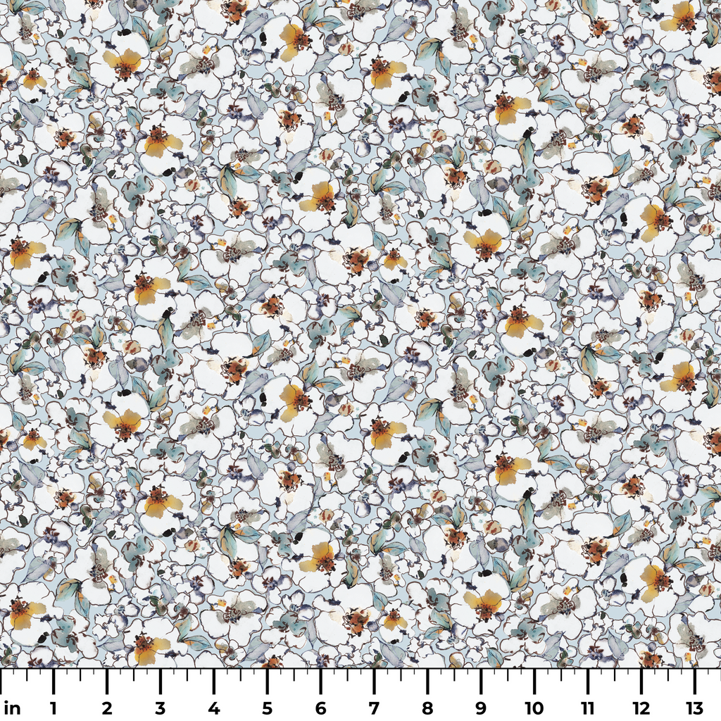 Delicate watercolor blossoms dance across a soft powder blue background in this enchanting floral pattern. Crisp white flowers with inky outlines mingle with subtle amber accents and sage green leaves, creating a dreamy garden effect with sophisticated yet whimsical appeal. This versatile fabric would make stunning spring dresses or breezy curtains that bring the feeling of a fresh garden indoors.