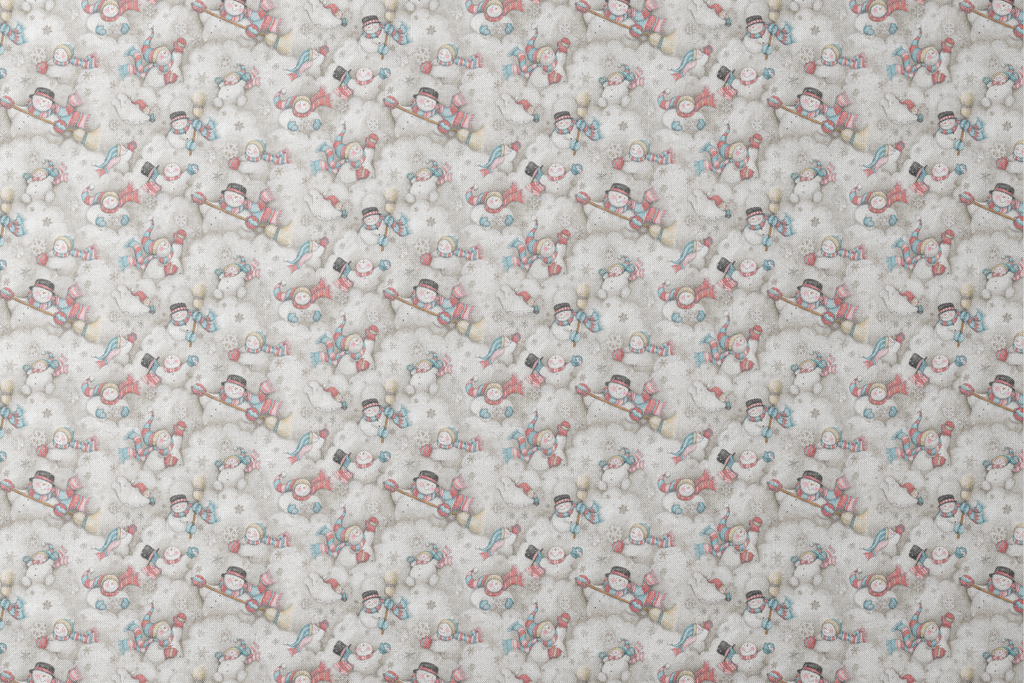 Festive snowman print featuring whimsical winter characters in scarves and hats on a light gray background with delicate snowflakes, perfect for holiday home decor.