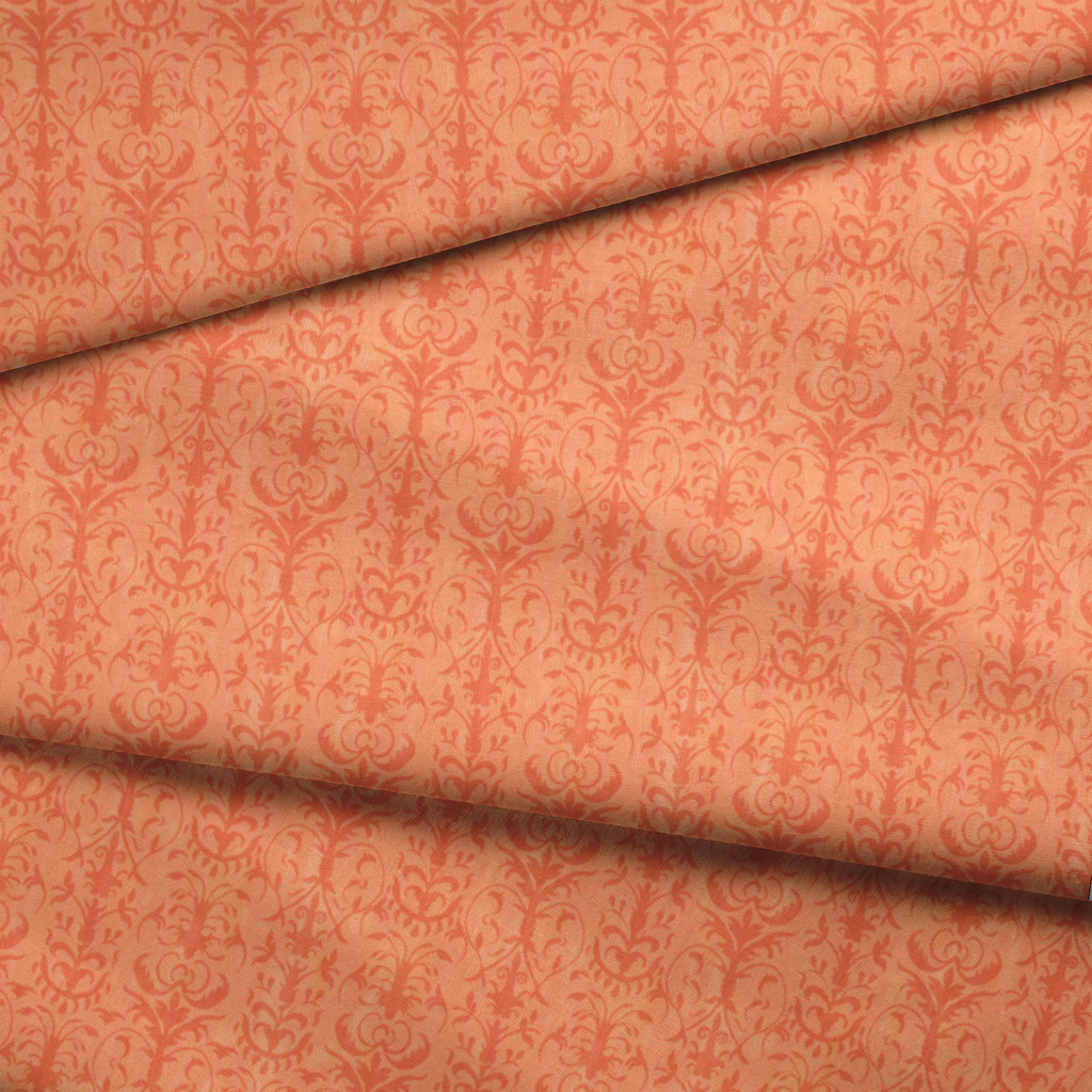 Elegant scrolling damask in warm tones dances across a soft peach background, creating a timeless pattern with Mediterranean flair. The intricate flourishes and symmetrical design give this fabric a touch of vintage sophistication while remaining surprisingly versatile. Perfect for accent pillows in a sunroom or dining room curtains that catch the golden hour light just right.