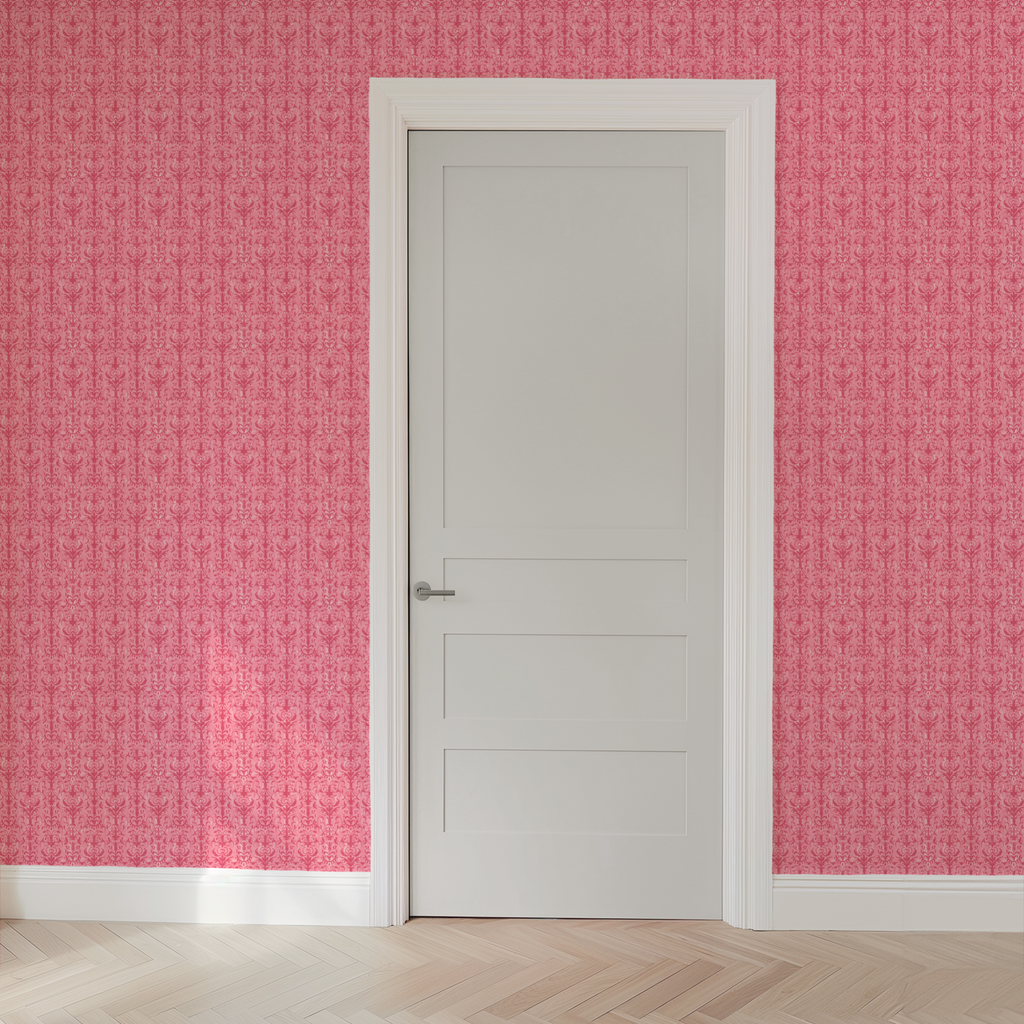 This elegant pink damask pattern features ornate scrollwork and floral motifs on a soft pink background, creating a vintage-inspired look perfect for a romantic aesthetic.
