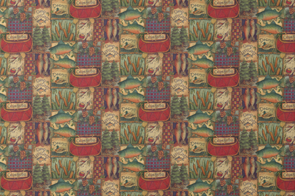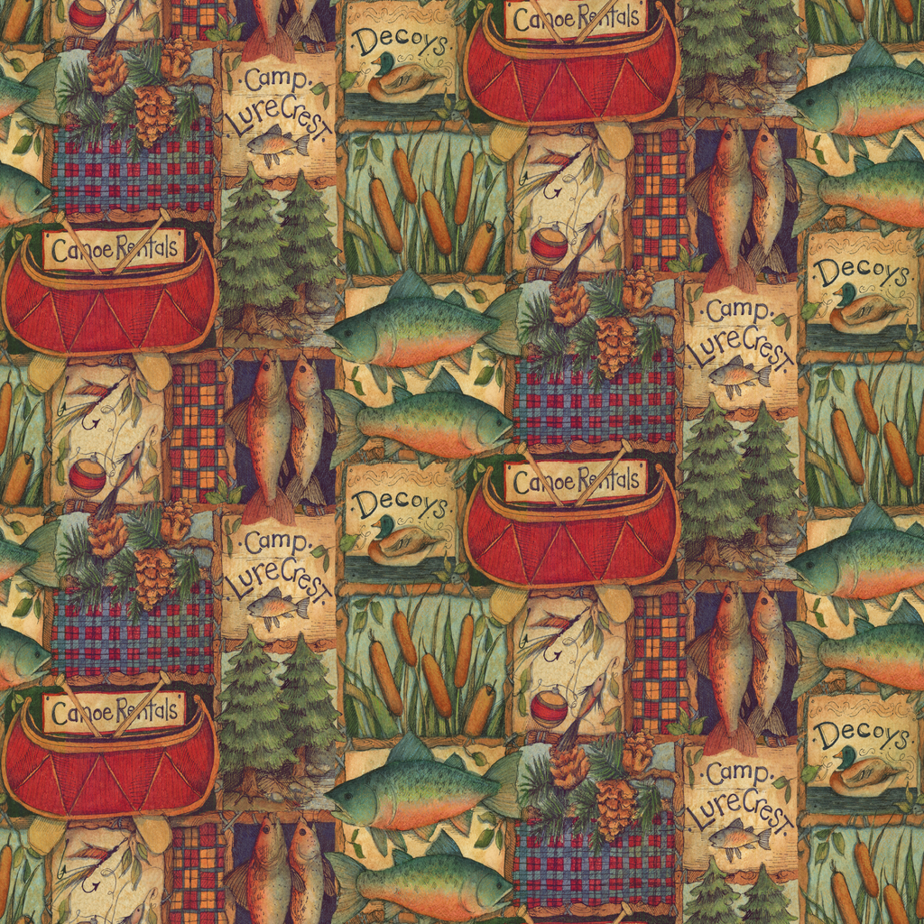 This rustic fishing-themed fabric features vibrant patterns of bass fish, canoes, and camping motifs in warm earth tones, perfect for cabin decor or outdoor-inspired quilting projects.