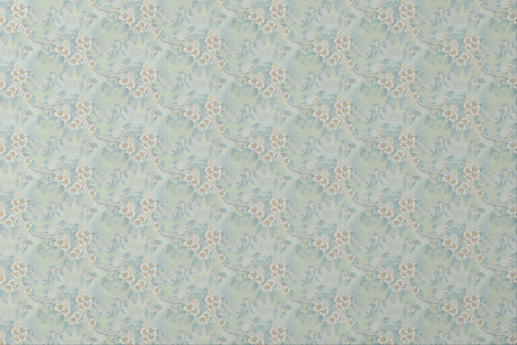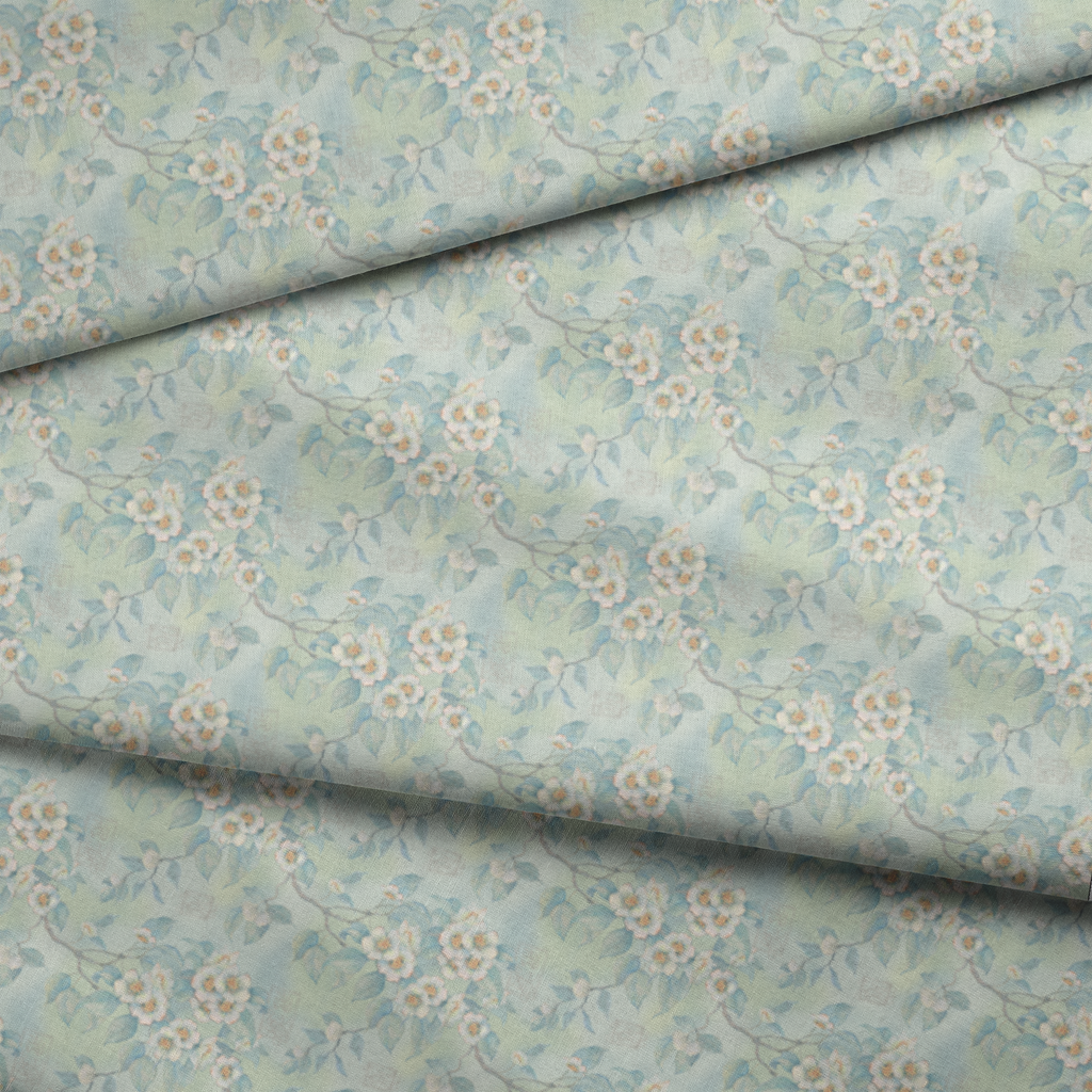 Soft vintage floral fabric with delicate white blossoms and pale blue-green leaves on a light mint background, perfect for creating a serene and elegant vibe for any project.