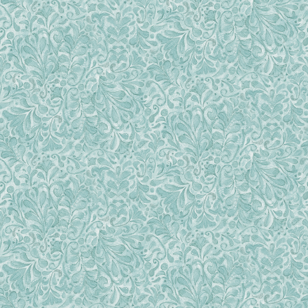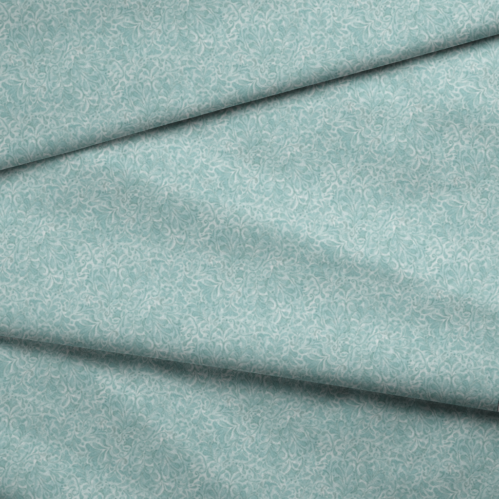 Delicate seafoam blue flourishes dance across a pale background in this elegant botanical pattern. The swirling leaves and tendrils create a soothing, vintage-inspired design with a watercolor-like quality that adds depth and movement. This fabric would make stunning accent pillows or a serene backdrop for a bedroom quilt, bringing a touch of tranquil sophistication to any space.