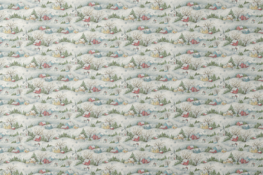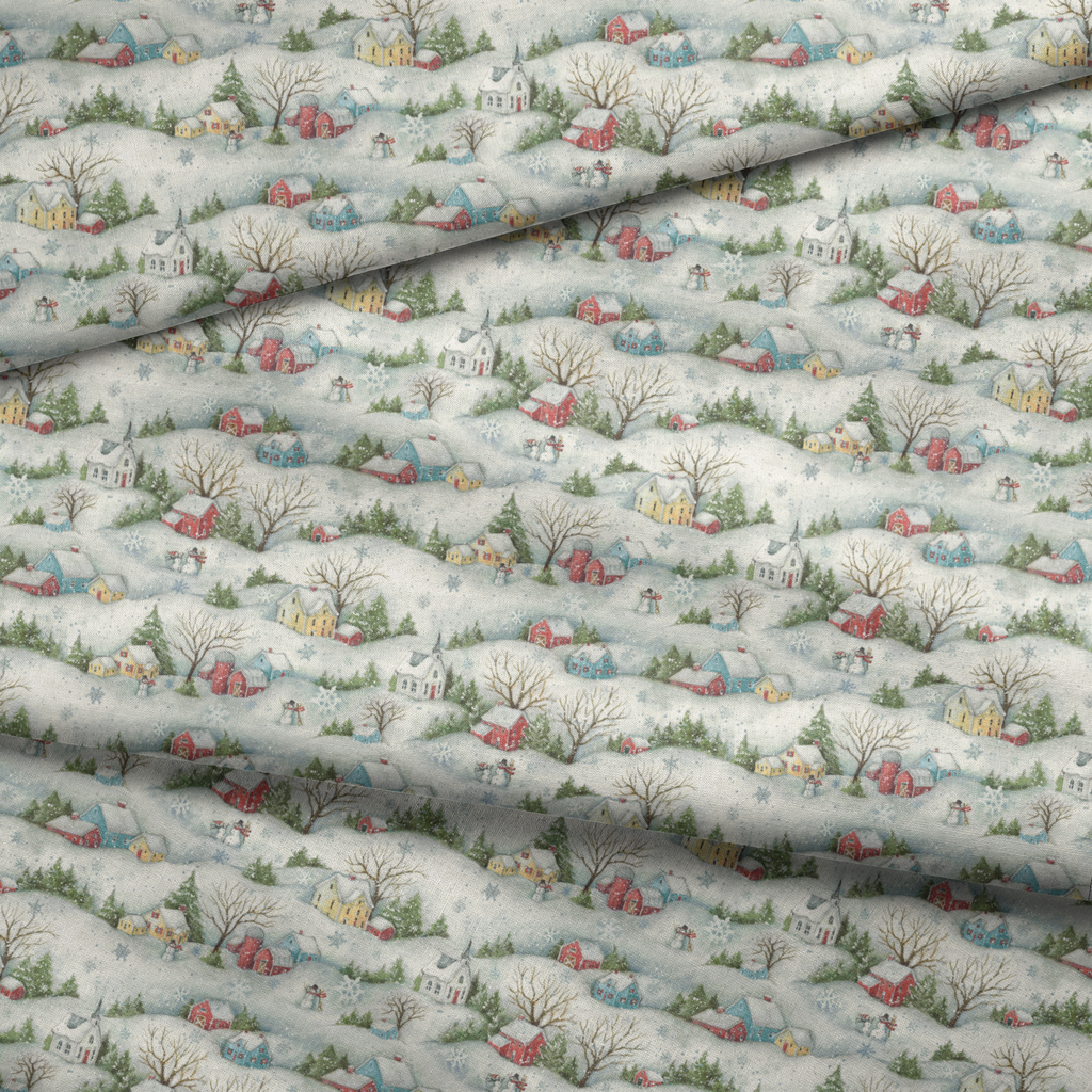 This charming winter village scene captures snowy landscapes dotted with colorful cottages, barns, and a small church, creating a nostalgic holiday pattern in traditional folk art style.