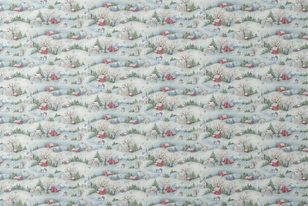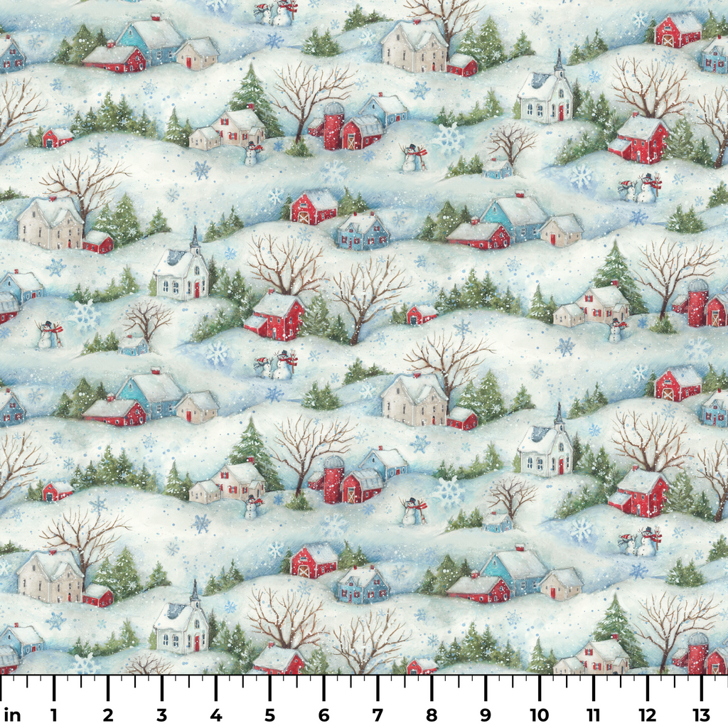 This charming winter wonderland fabric showcases a snowy village scene with tiny red barns, white churches, and quaint houses nestled among evergreen trees. A folk-art inspired perfect for Christmas and winter holiday projects.