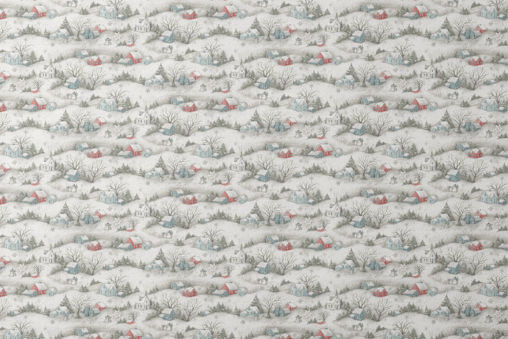 This charming winter village scene features a snowy landscape with red barns, small houses, and bare trees in a vintage folk art style, perfect for holiday home decor.