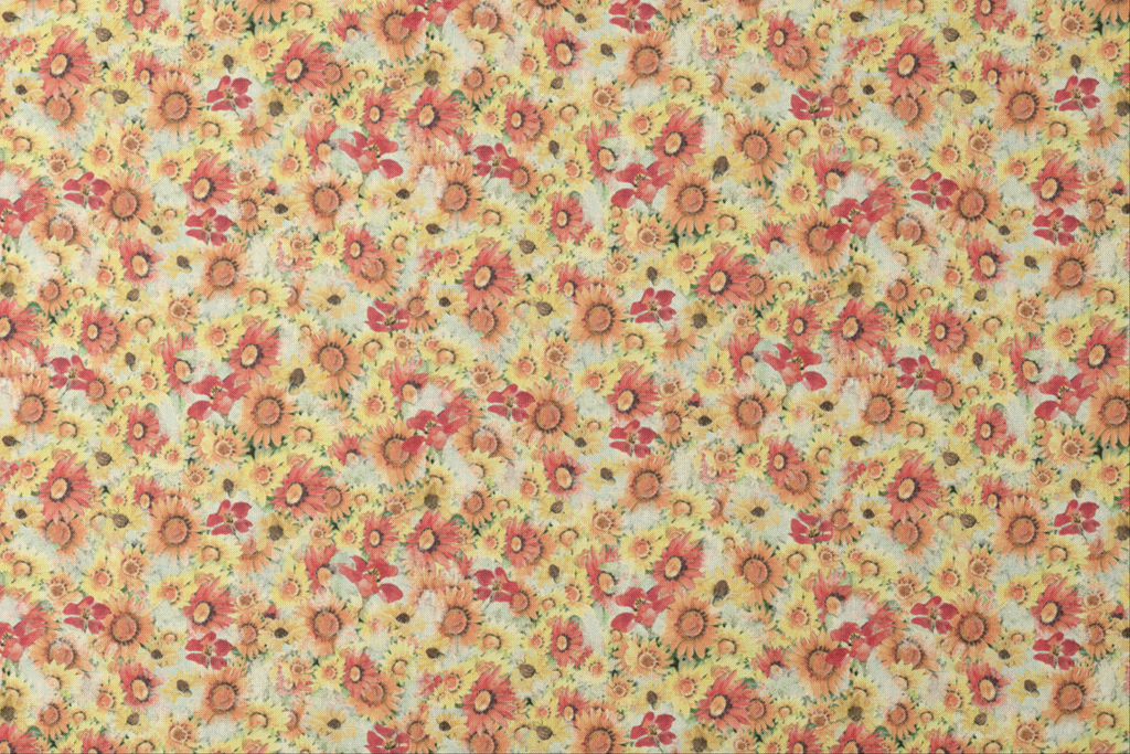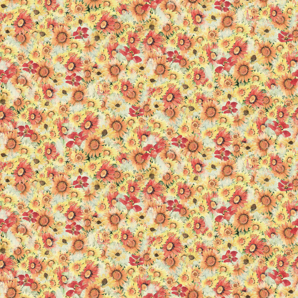 A lush garden of sunflowers blooms across this fabric in warm golden yellows and rusty oranges, accented with striking red wildflowers scattered throughout. The painterly watercolor effect gives the floral pattern a handcrafted, artistic quality against the subtle cream background. This cheerful fabric brings summer sunshine to any project—perfect for kitchen accessories like aprons and tea towels or seasonal home décor items that celebrate the warmth of harvest time.