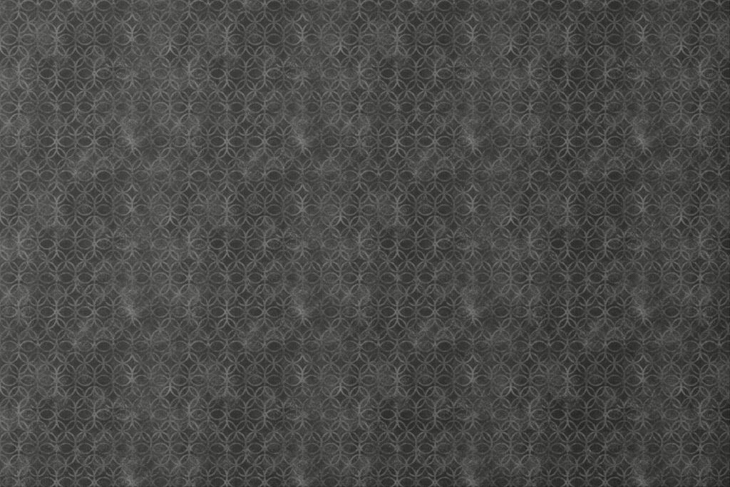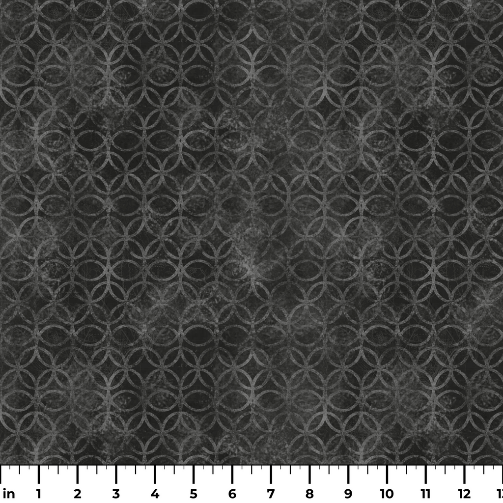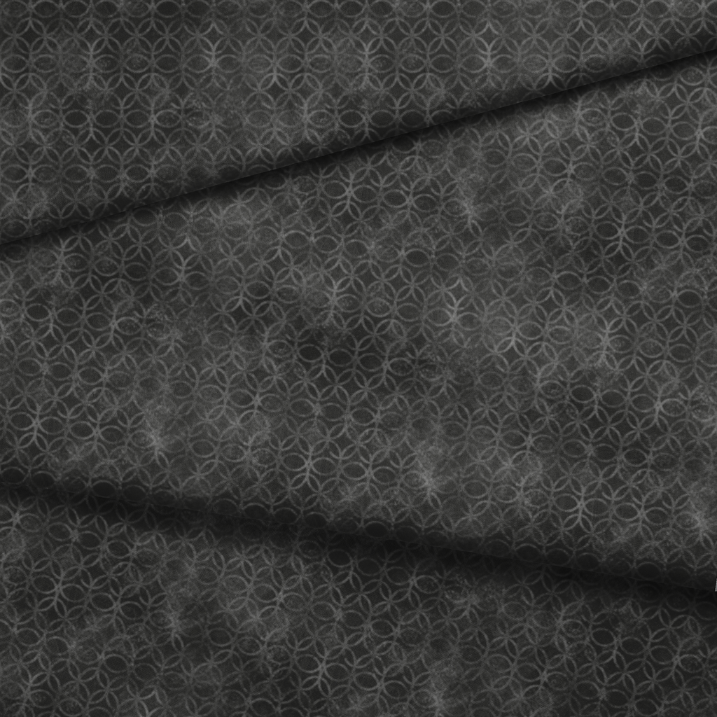 Sophisticated charcoal gray interlocking circles create a mesmerizing geometric lattice with a weathered, textural appearance. The subtle tonal variations give this pattern depth and character, reminiscent of ancient stonework or hand-printed textile techniques. This versatile fabric would make a stunning backdrop for modern quilting projects or add dramatic flair to home décor accessories like throw pillows or table runners.