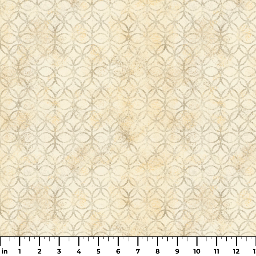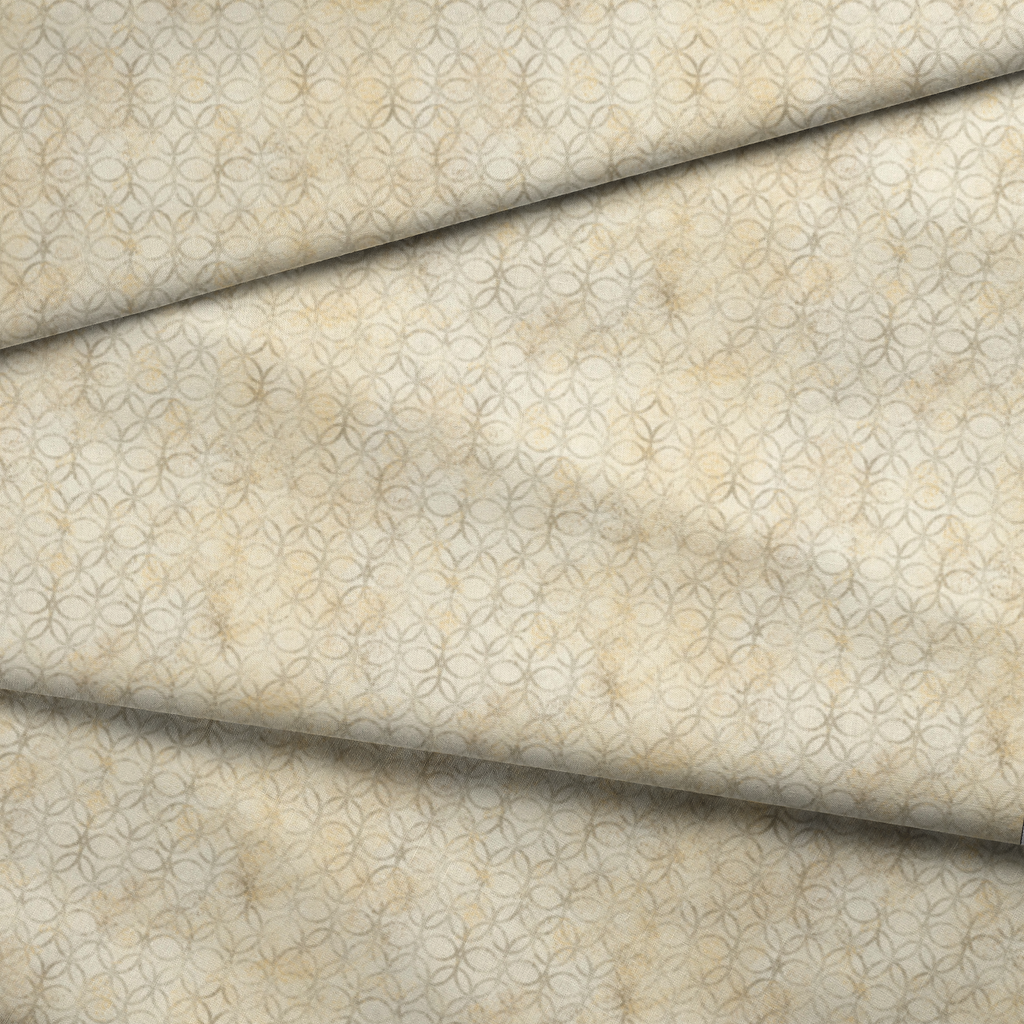 This elegant fabric features a timeless interlocking circle pattern in soft weathered gray against a warm cream background with subtle yellow undertones. The distressed, vintage-inspired finish gives the geometric design a handcrafted feel, resembling old-world tile work or hand-stamped patterns. Perfect for sophisticated home décor projects like pillow covers, table linens, or lightweight curtains that need a touch of subtle texture without overwhelming your space.