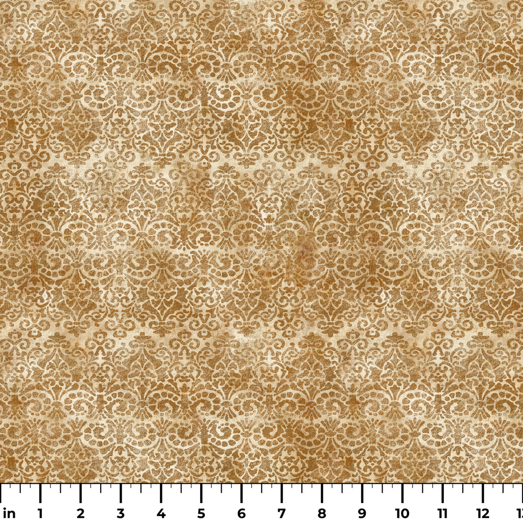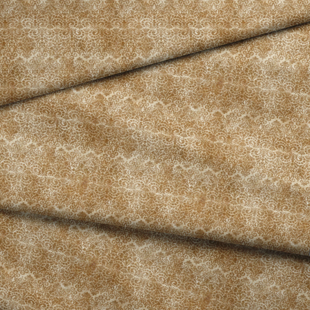 Elegant beige damask swirls dance across a weathered cream background, creating a timeless pattern with vintage charm. The intricate scrollwork and flourishes have a hand-stamped quality, giving the fabric a rich, heirloom feel. This sophisticated textile would bring warmth to home decor projects like pillow covers and table runners, or add a touch of luxury to handcrafted gift bags.