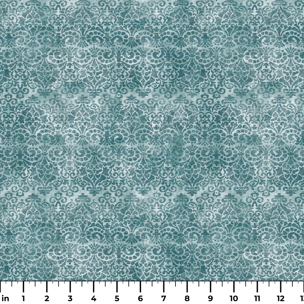 Elegant slate blue damask patterns bloom across a misty pale background, creating a sophisticated vintage feel with subtle watercolor-like texture. The intricate scrollwork and floral motifs give this fabric a timeless quality that would add understated luxury to home decor projects. Perfect for creating accent pillows, elegant table linens, or as a refined backing for quilting projects that need that special finishing touch.