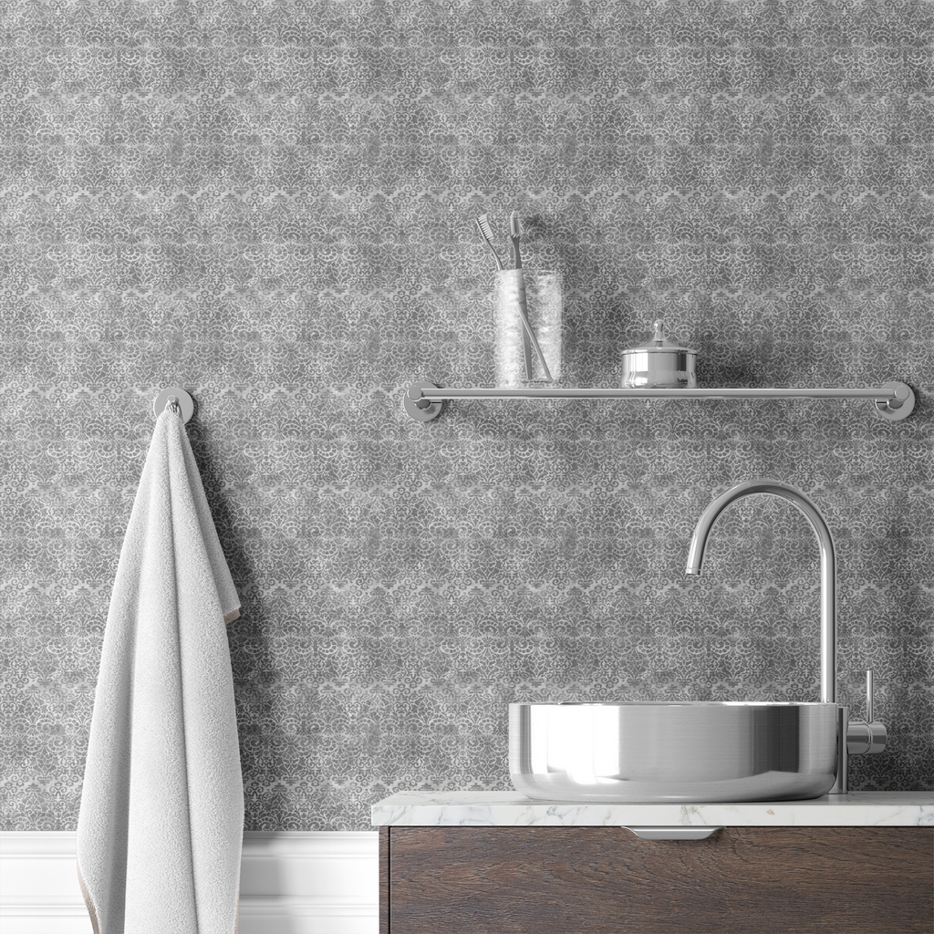 Elegant gray and white damask pattern with intricate floral motifs creates a sophisticated vintage look for any space.
