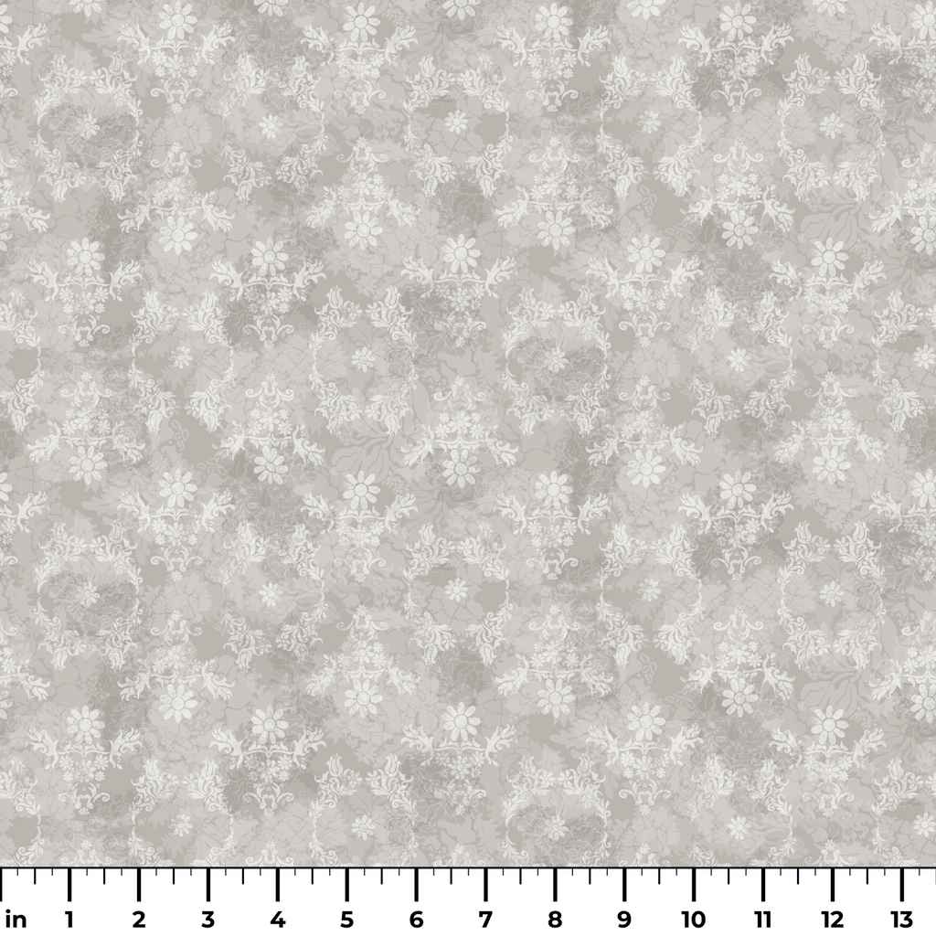 Elegant white damask flourishes dance across a soft gray marbled background, creating a timeless pattern with subtle depth and texture. Delicate floral motifs are woven throughout the design, bringing a touch of refined sophistication to this versatile fabric. Perfect for creating elegant home décor like pillow covers and draperies, or as a stunning accent fabric in quilting projects where understated luxury is desired.