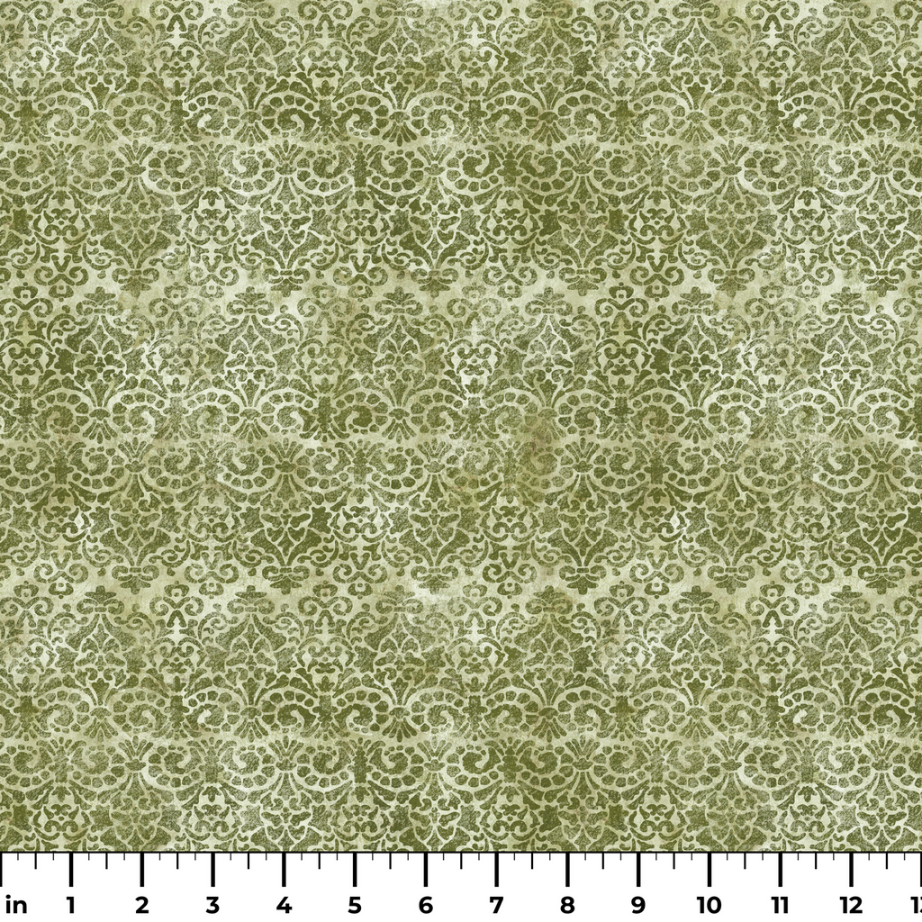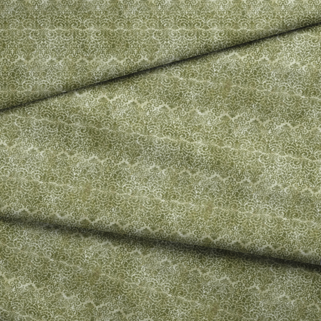 Intricate olive damask patterns dance across a weathered cream background, creating a timeless elegance with a vintage feel. The ornate scrollwork and flourishes have a hand-stamped quality, giving this fabric a rich, textural appearance despite its flat weave. Perfect for sophisticated home decor projects like accent pillows or table runners, this fabric also makes stunning linings for keepsake boxes or heritage scrapbook covers.
