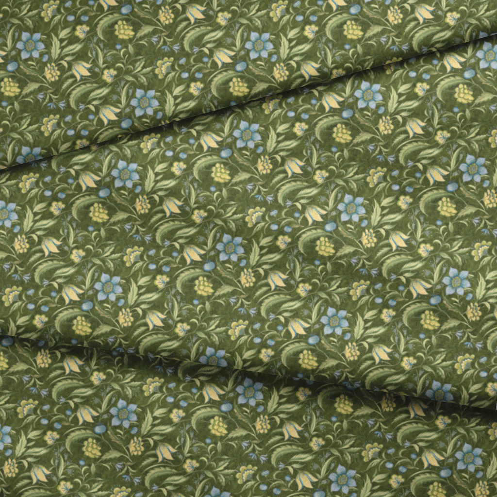 Elegant floral pattern featuring blue blooms and yellow accents on a deep green background, perfect for vintage-inspired home decor or cottage garden aesthetic.