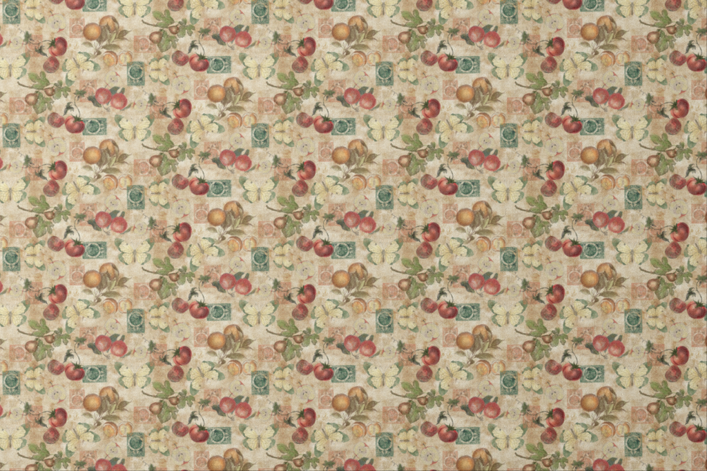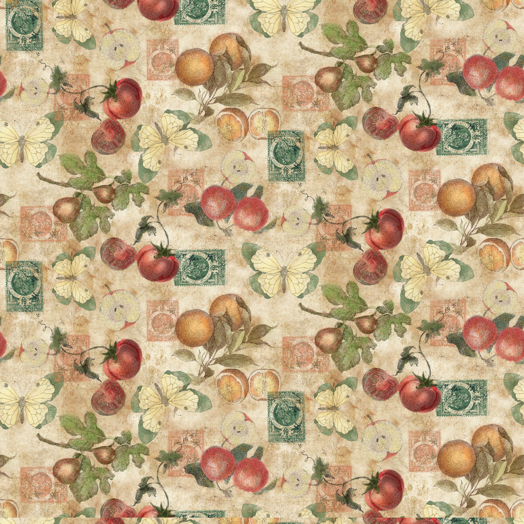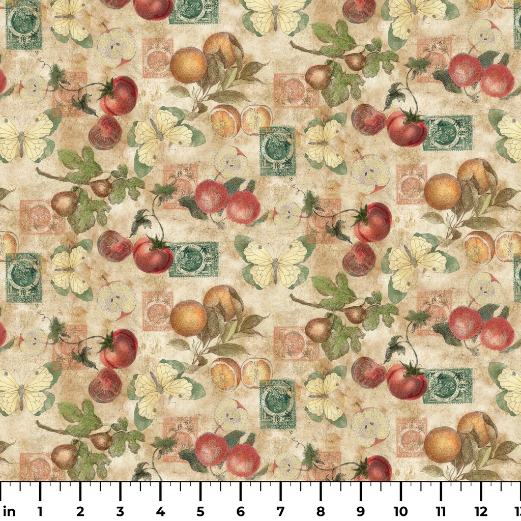 This enchanting fabric features a vintage-inspired collage of ripe fruits and delicate butterflies against a warm, antique parchment background. Juicy red tomatoes, golden oranges, and rustic figs are scattered among cream-colored butterflies, creating a nostalgic garden harvest feel. Perfect for kitchen curtains, table linens, or cottage-style quilting projects that bring warmth and character to your space.
