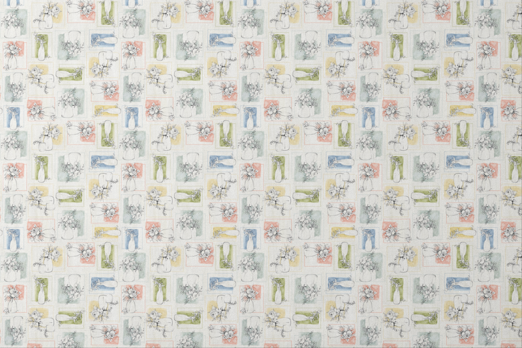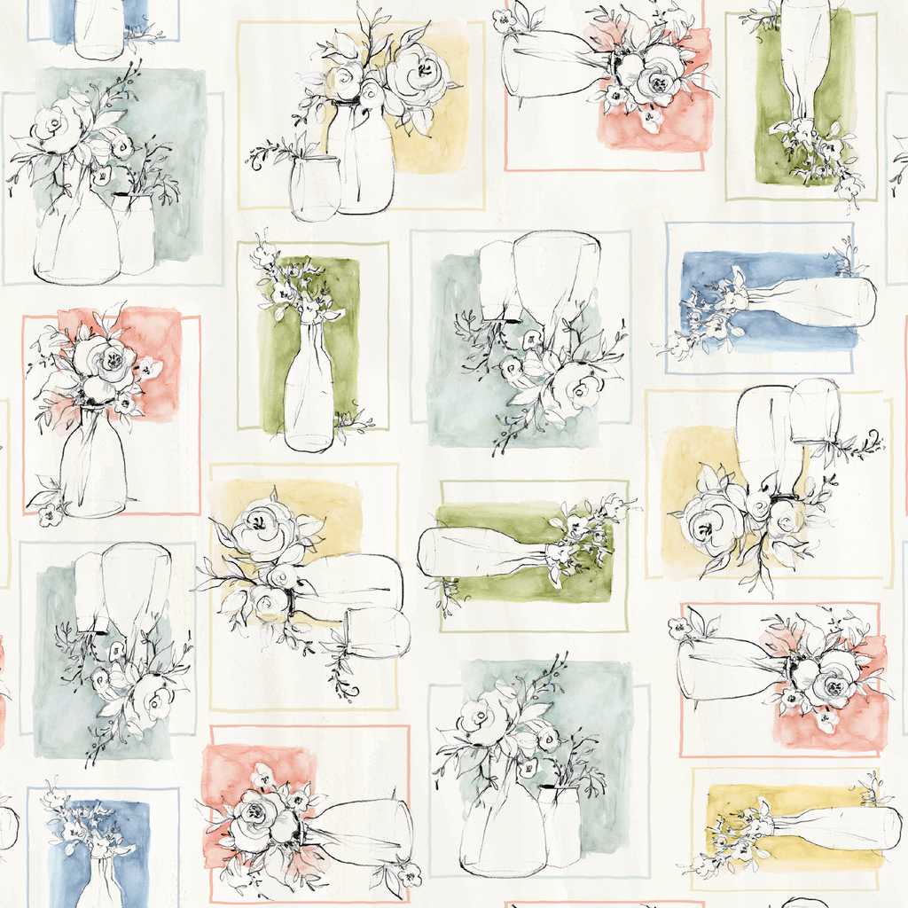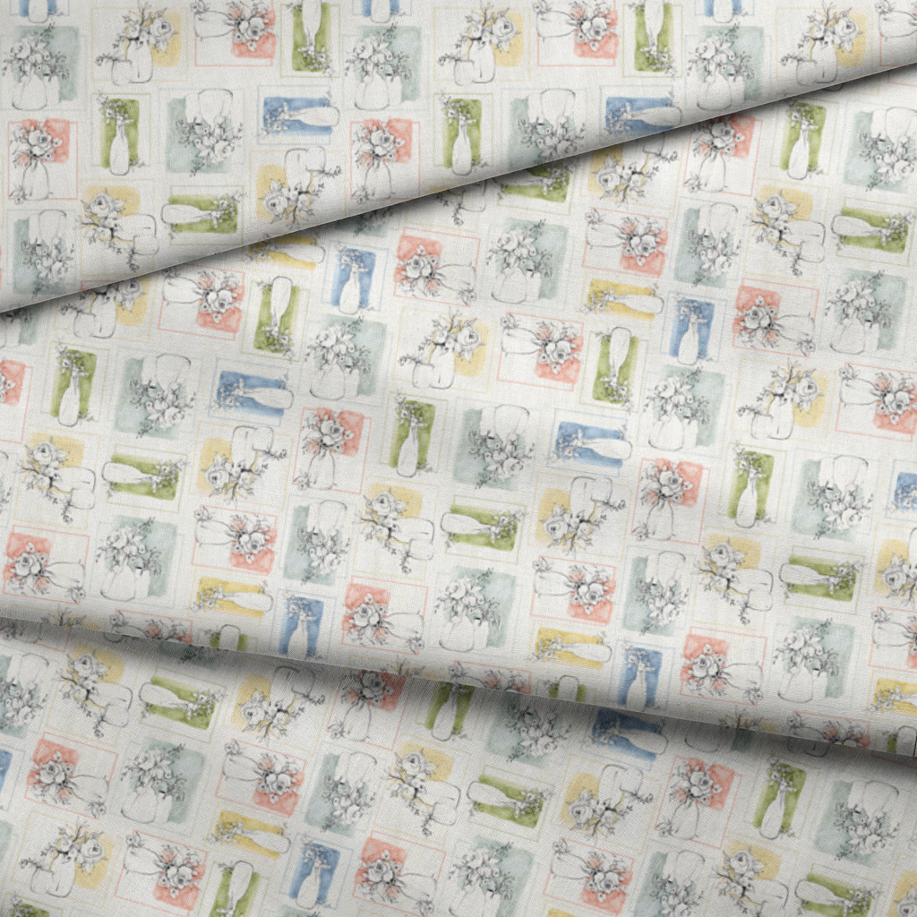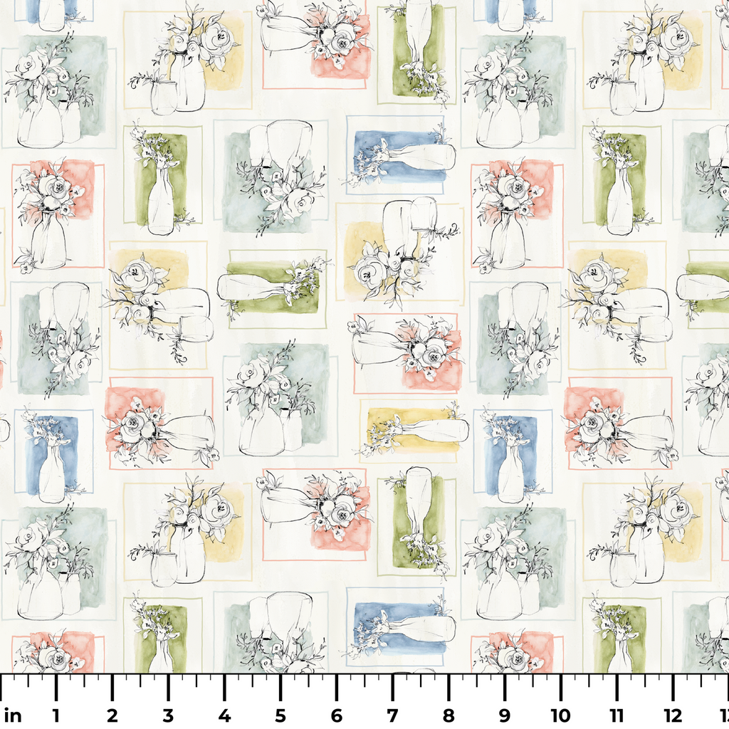 Delicate ink-sketched floral arrangements in white vases dance across this charming fabric, each framed by softly watercolored squares in soothing pastels of coral, sage, buttercream, and powder blue. The artistic line drawings capture the grace of freshly cut blooms with a light, airy touch that evokes the feel of a watercolor sketchbook. This fabric would make a stunning accent for kitchen café curtains, decorative throw pillows, or a lovely table runner for your spring gatherings.