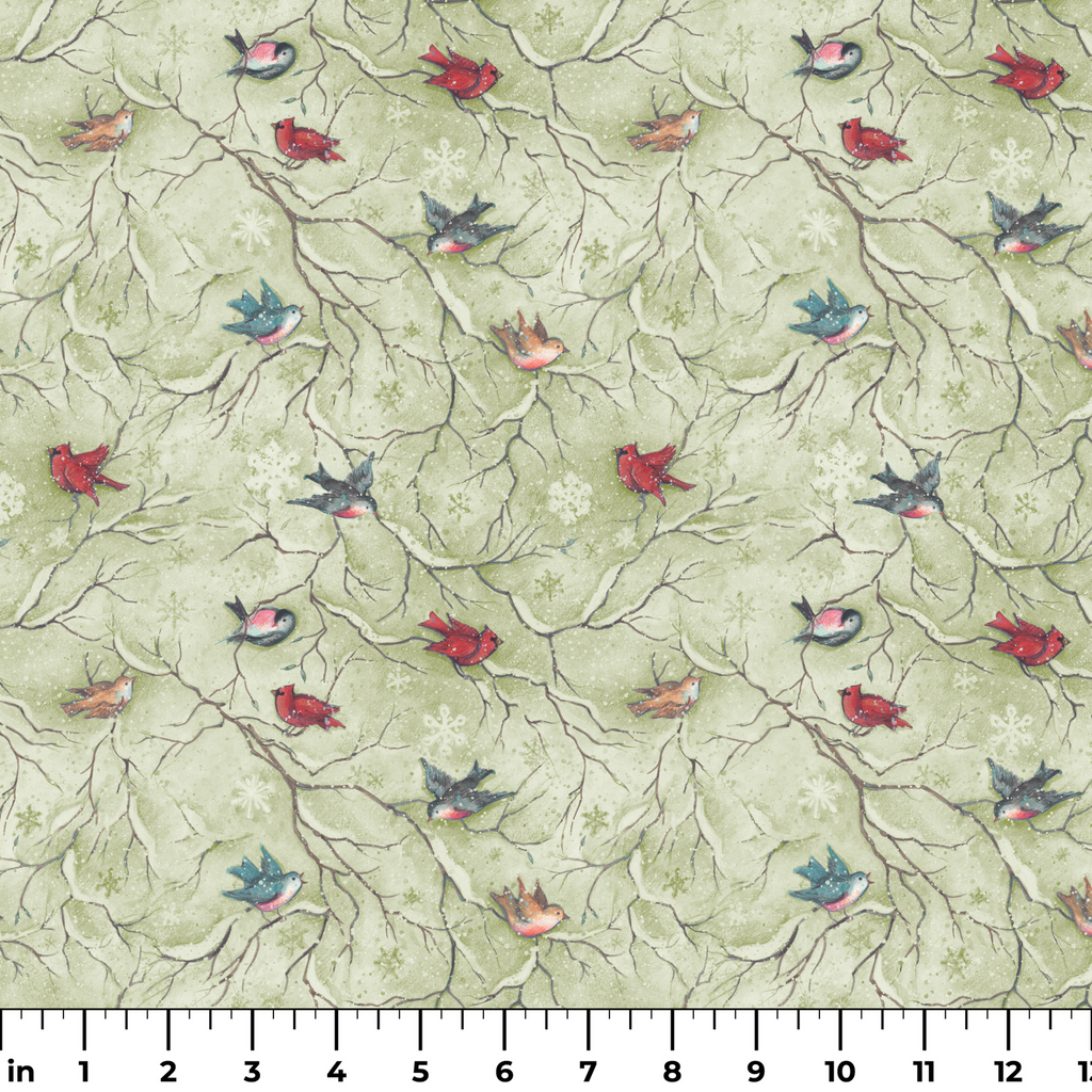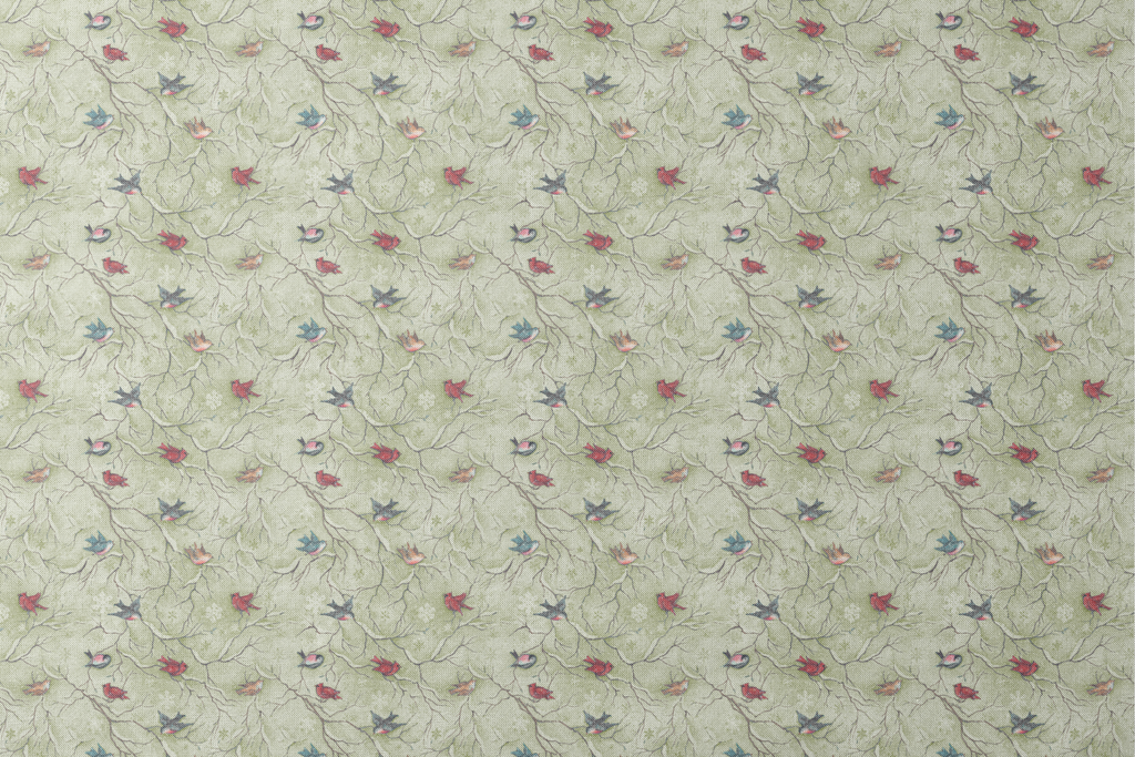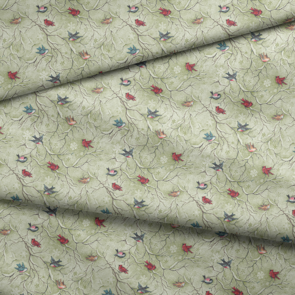 Delicate watercolor birds in vibrant red and blue hues flutter among soft green branches, creating a whimsical woodland pattern perfect for nature-inspired home décor or quilting projects.