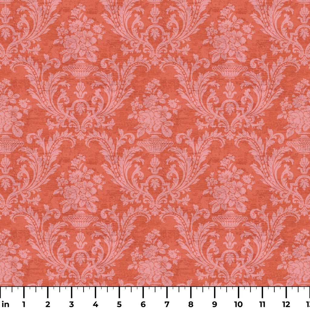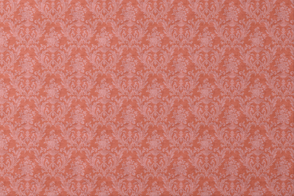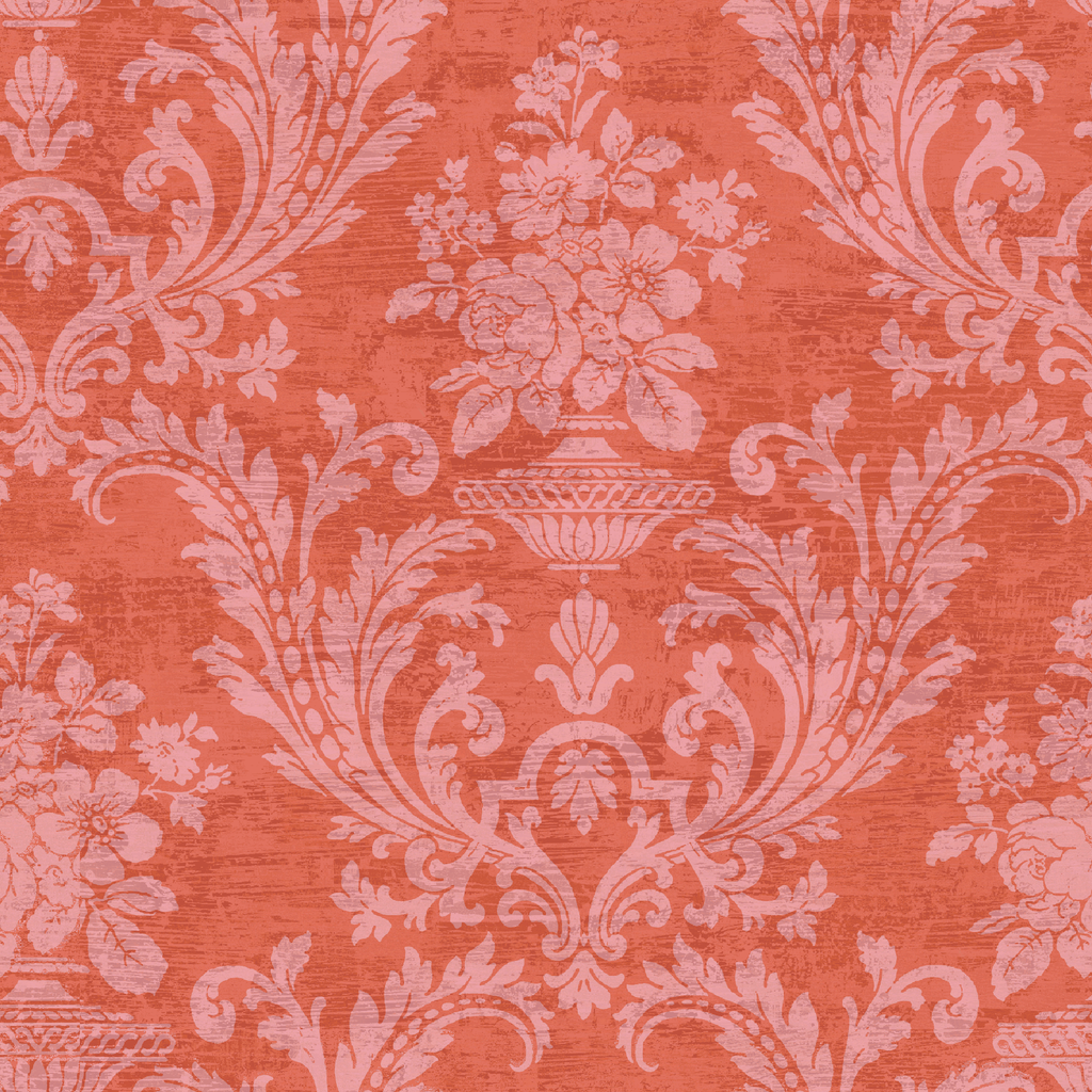 Elegant coral damask wallpaper featuring ornate floral motifs and scrolling acanthus leaves in a classic traditional pattern. Perfect for heritage-inspired home decor with a sophisticated, romantic aesthetic.