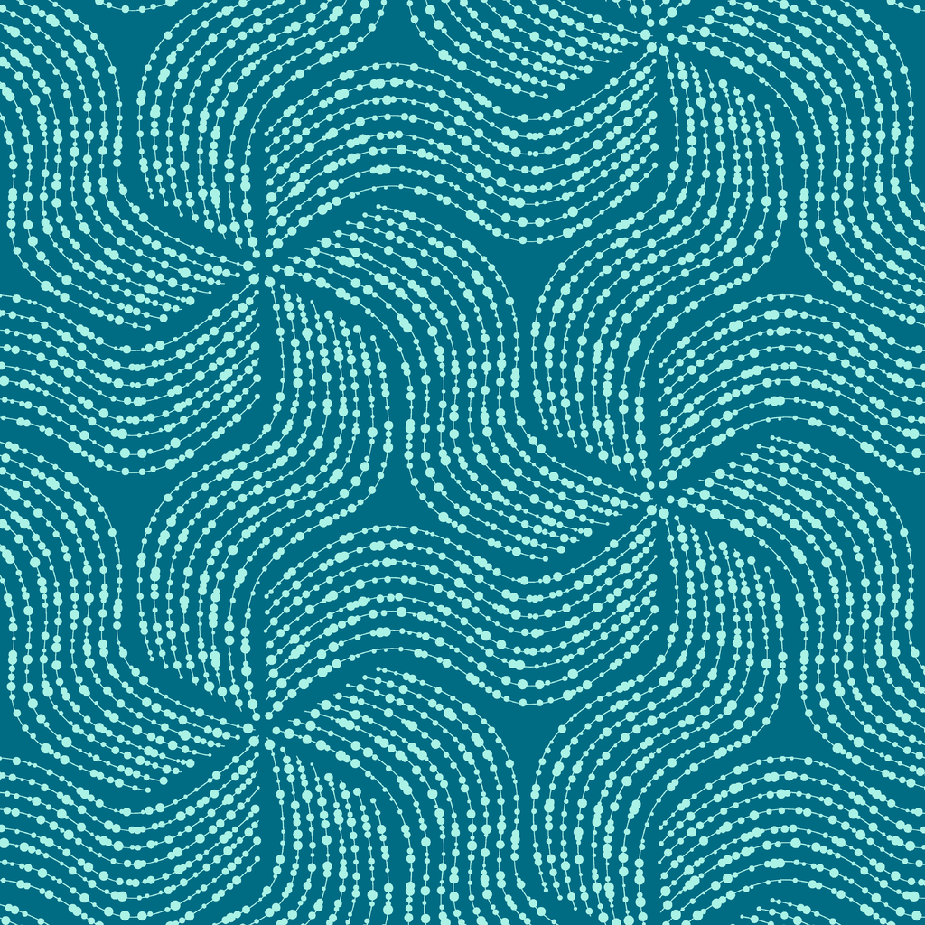 Dark teal design featuring flowing dotted waves in a mesmerizing aboriginal-inspired pattern with white beaded details creating rhythmic curved lines across the surface.