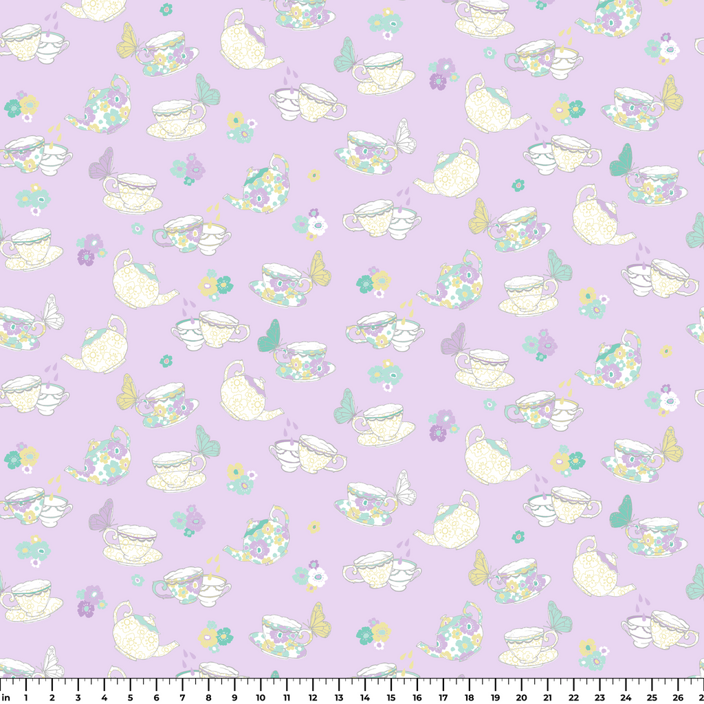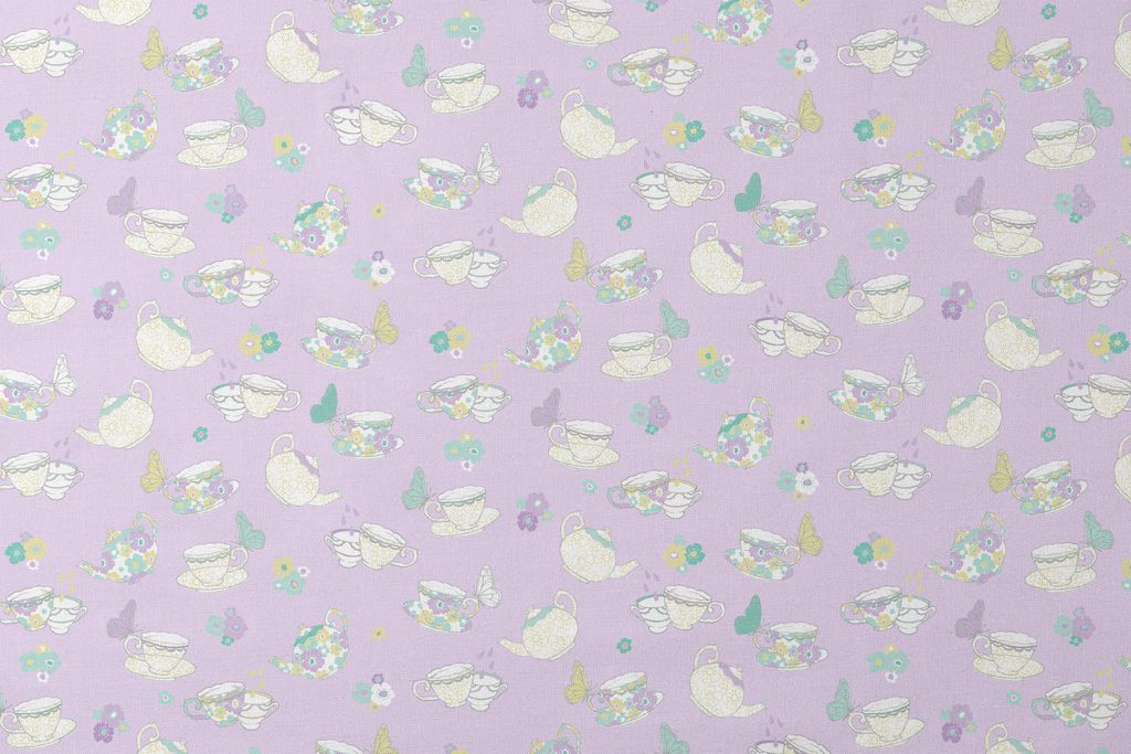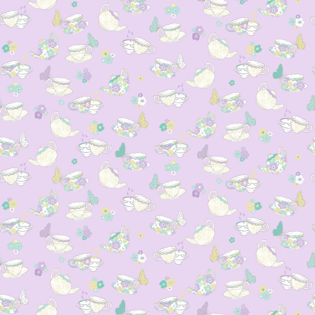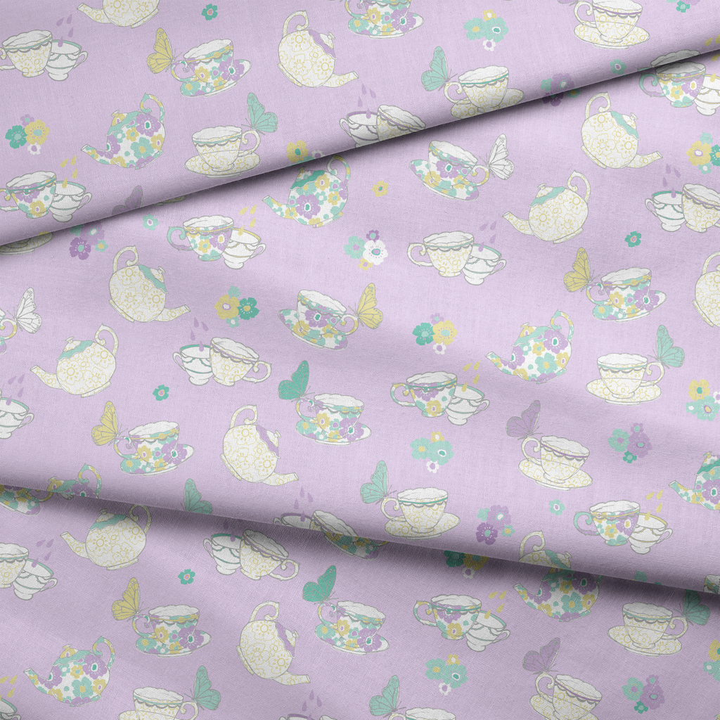 Dreamy pastel pattern featuring adorable white teacups and teapots scattered with colorful flowers and delicate butterflies on a soft lavender background. Perfect for baby nursery decor or Easter-themed projects.