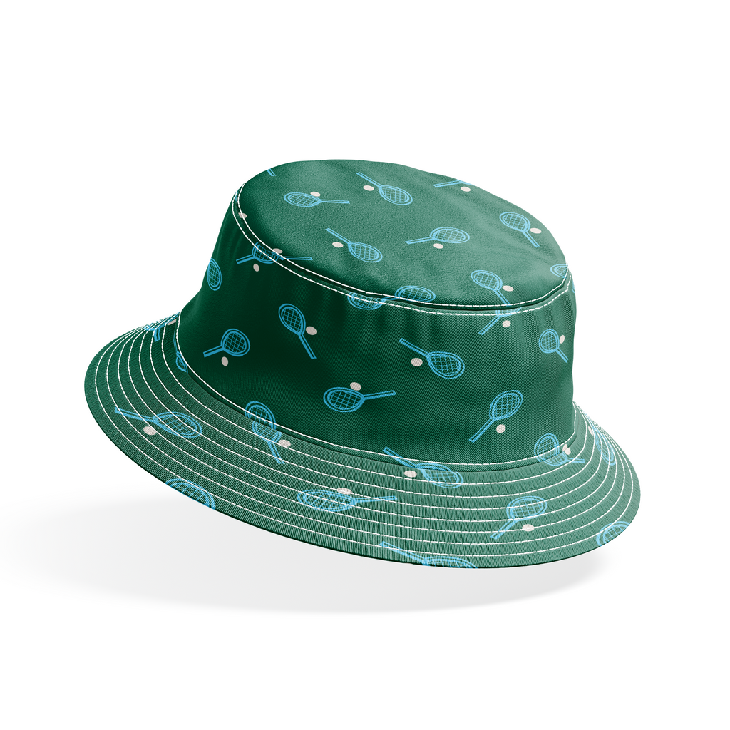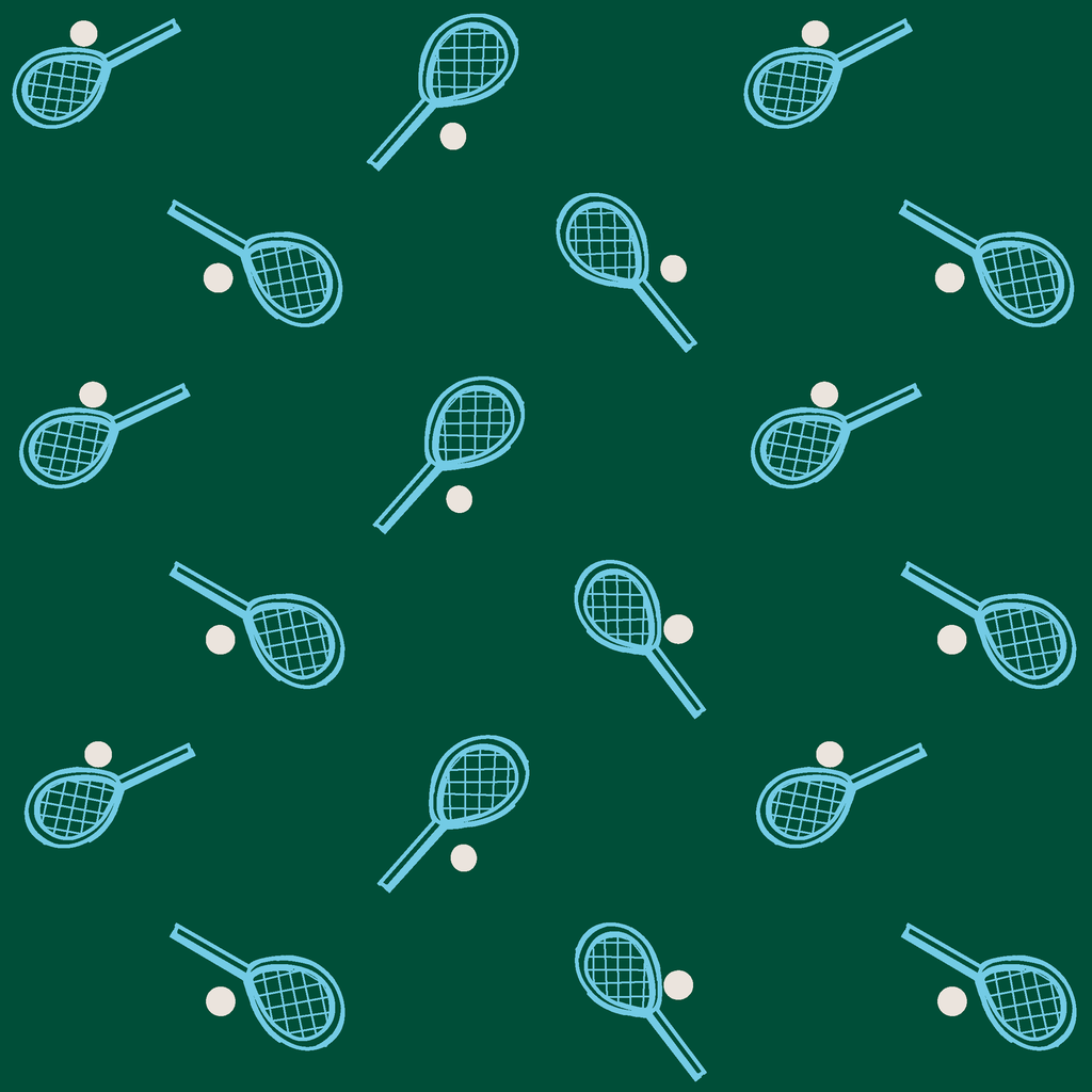 Classic tennis racket and ball pattern in turquoise and white on a classic green background, perfect for retro sports enthusiasts and preppy style lovers.
