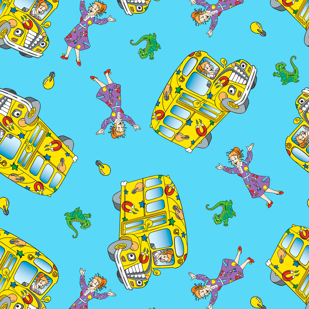 This whimsical toss pattern features Ms. Frizzle and Liz ready to blast off on a field trip adventure on a blue background - perfect for back-to-school, young scientists, or fans of the beloved educational science series