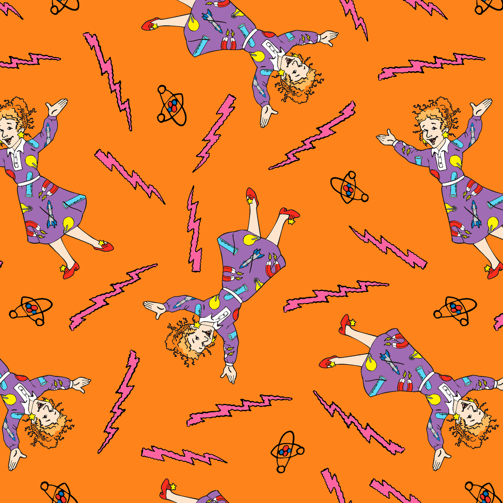 This fun toss design features Ms. Frizzle and pink electric lightning bolts on an orange background, perfect for fans of the beloved educational science series