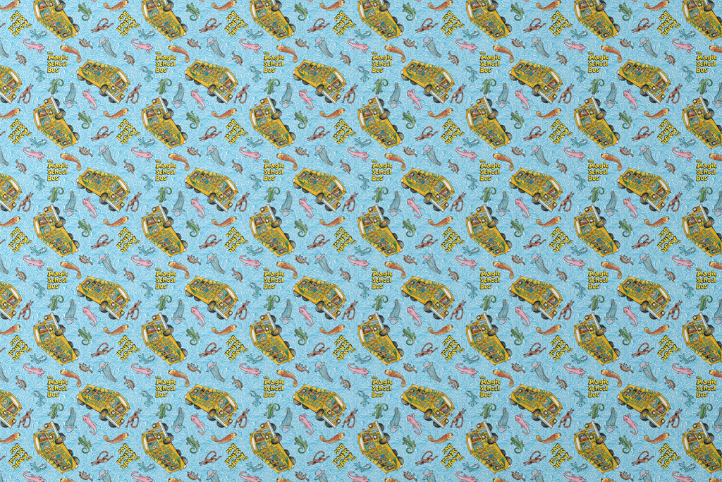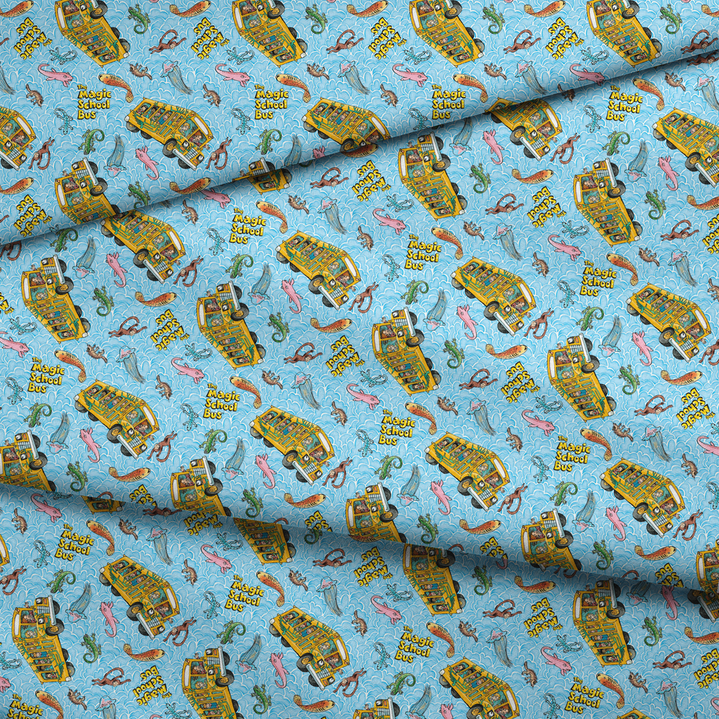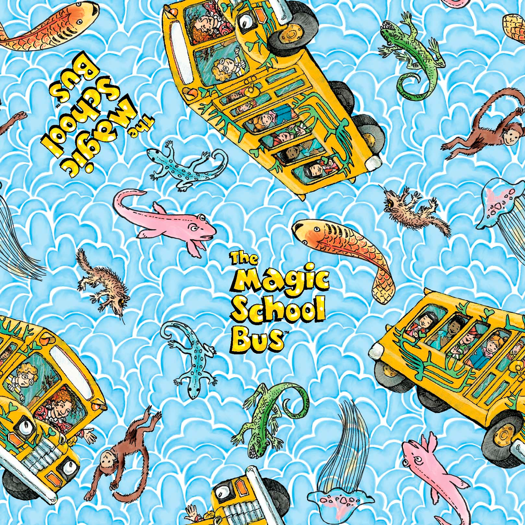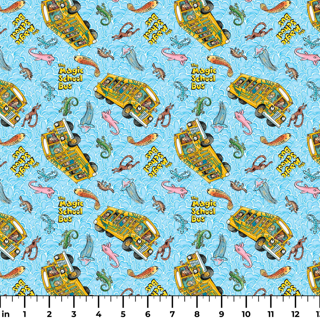 Dive into adventure with this vibrant toss pattern featuring Ms. Frizzle's iconic transforming bus and class, zooming back to prehistoric times to watch simple cells become fish, lizards, and mammals on a blue background - perfect for fans of the beloved educational series.