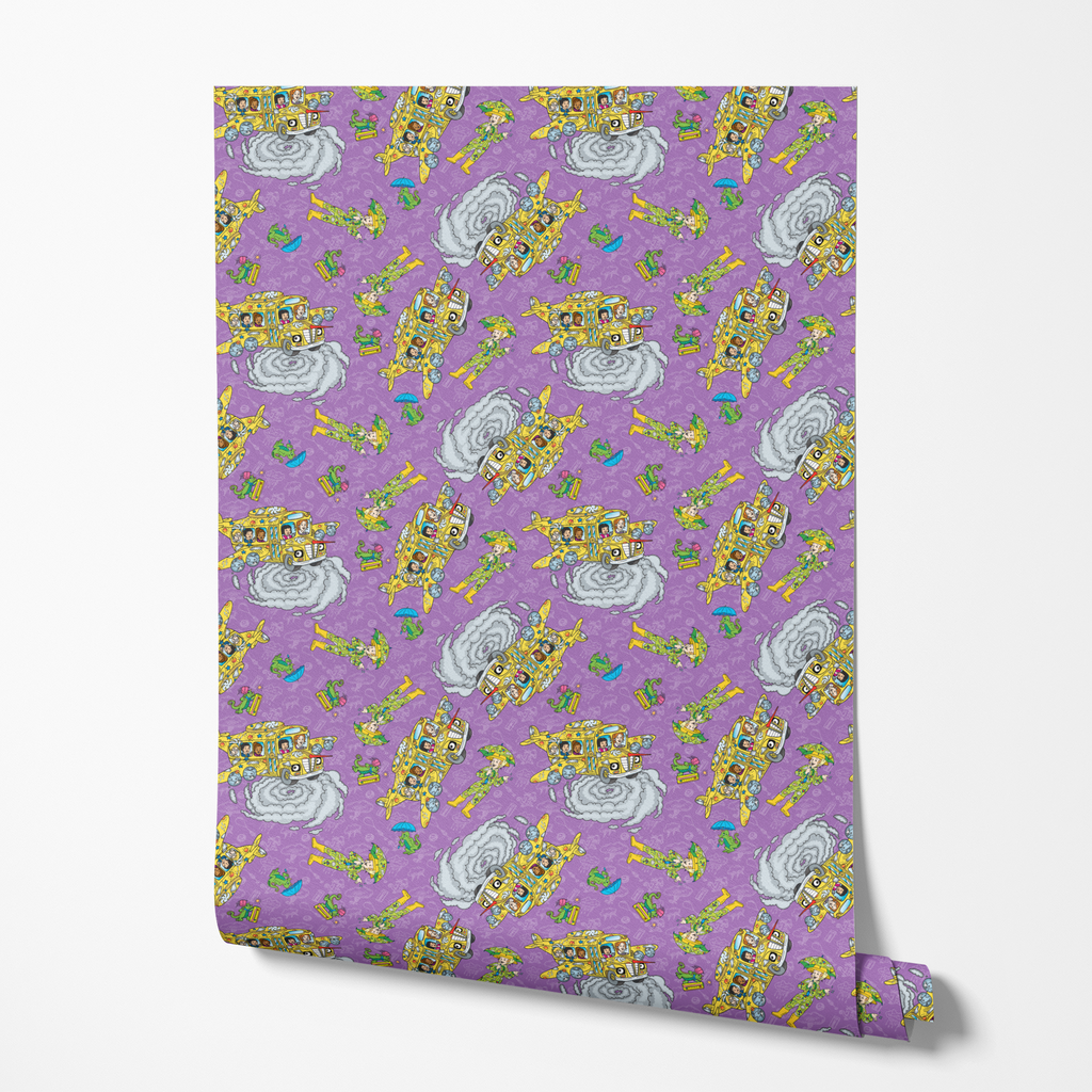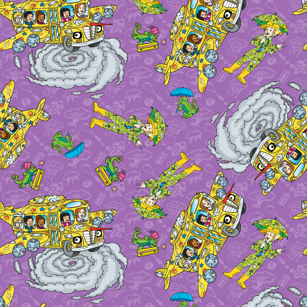 This playful The Magic School Bus toss pattern features Ms. Frizzle's iconic transforming bus, whisking the class on a field trip adventure, flying through the clouds and learning about weather on a purple background. Perfect for fans of the beloved educational series.
