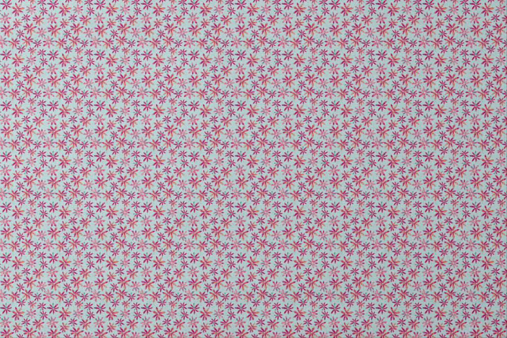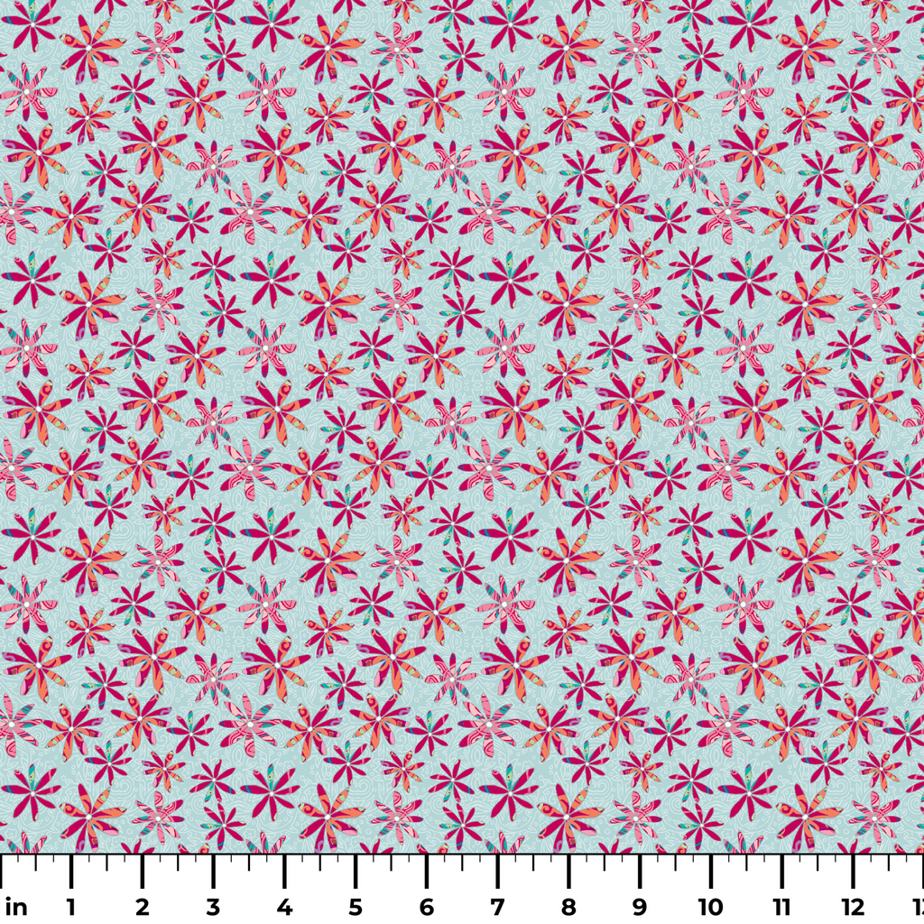 Vibrant daisy-like blooms in magenta, coral, and pink dance across a soothing mint blue background with delicate white scrollwork. Each flower features uniquely patterned petals - some with swirls, others with stripes - creating a playful yet sophisticated botanical design. This eye-catching fabric would make stunning summer dresses or cheerful accent pillows that bring instant character to any space.